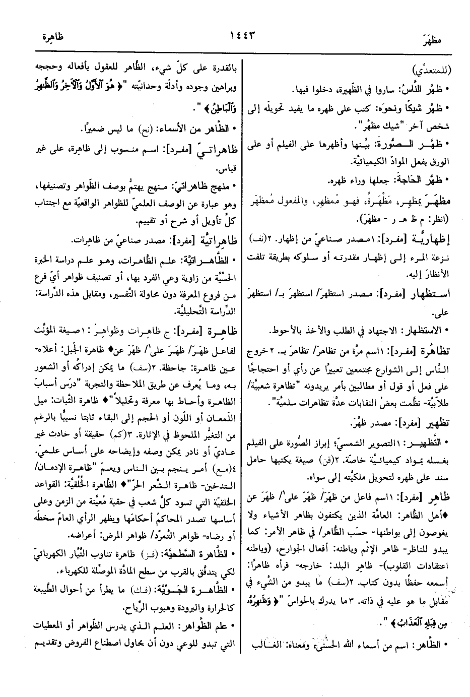 1 - صيغة المؤنَّث لفاعل ظهَرَ/ ظهَرَ على1/ ظهَرَ عن ° ظاهرة الجَبل: أعلاه- عين ظاهرة: جاحظة.