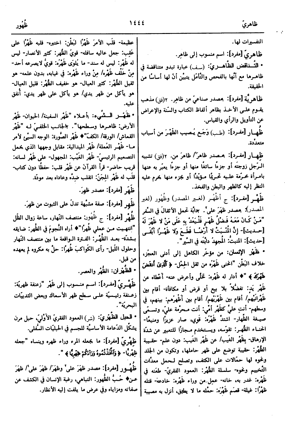 • ظَهْر الإنسان: من مؤخّر الكاهل إلى أدنى العجُز، خلاف البَطْن "انحنى ظَهْرُه من ثقل الحِمْل- {الَّذِي أَنْقَضَ ظَهْرَكَ} " ° أدار له ظَهْره: تخلَّى وأعرض عنه- أَعْطاه عن ظَهْر يَدٍ: تفضُّلاً بلا بيع أو قرض أو مكافأة- أقام بين ظَهْرانَيْهم/ أقام بين ظَهْرَيْهم/ أقام بين أَظْهرُهم: بينهم، في وسطهم- أنتِ عليَّ كظَهْر أمِّي: أنت محرَّمة عليّ، وتسمّى صيغة الظِّهار- اشتدَّ ظَهْرُه: قَوِي، صار عزيزًا ومنيعًا- انحناء الظَّهر: تقوّسه، ويستخدم مجازًا للتعبير عن شدّة الإرهاق- بِظَهْر الغَيب/ عن ظَهْر الغَيب: دون علم- حقيبة الظَّهْر: حقيبة توضع على ظهر حاملها، وتكون من الجلد ونحوه لها حمّالات على الكتف، وتصلح لحمل معدَّات التَّخييم ونحوه- سلسلة الظَّهْر: العمود الفقريّ- طعَنه في ظَهْره: غدر به، خانه- عمِل من وراء ظَهْره: خادعه- قتله ظهْرًا: غيلة- قصَم ظَهْرَه: حمَّله ما لا يطيق، أنزل به مصيبة عظيمة- قلَب الأمرَ ظَهْرًا لبَطْن: اختبره- قلبه ظَهْرًا على عَقِب: جعل عاليه سافله- قويّ الظَّهر: كثير الأنصار- ليس له ظَهْر: ليس له سند- ما يُلوَى ظَهْرُه: قويٌّ لايصرعه أحد- مِنْ خَلْف ظَهْره/ مِنْ وراء ظَهْره: في غيابه، بدون علمه- هو ثقيل الظَّهْر: كثير العيال- هو خفيف الظَّهْر: قليل العيال- هو يأكل من ظهر يدي/ هو يأكل على ظهر يدي: أُنفق عليه.