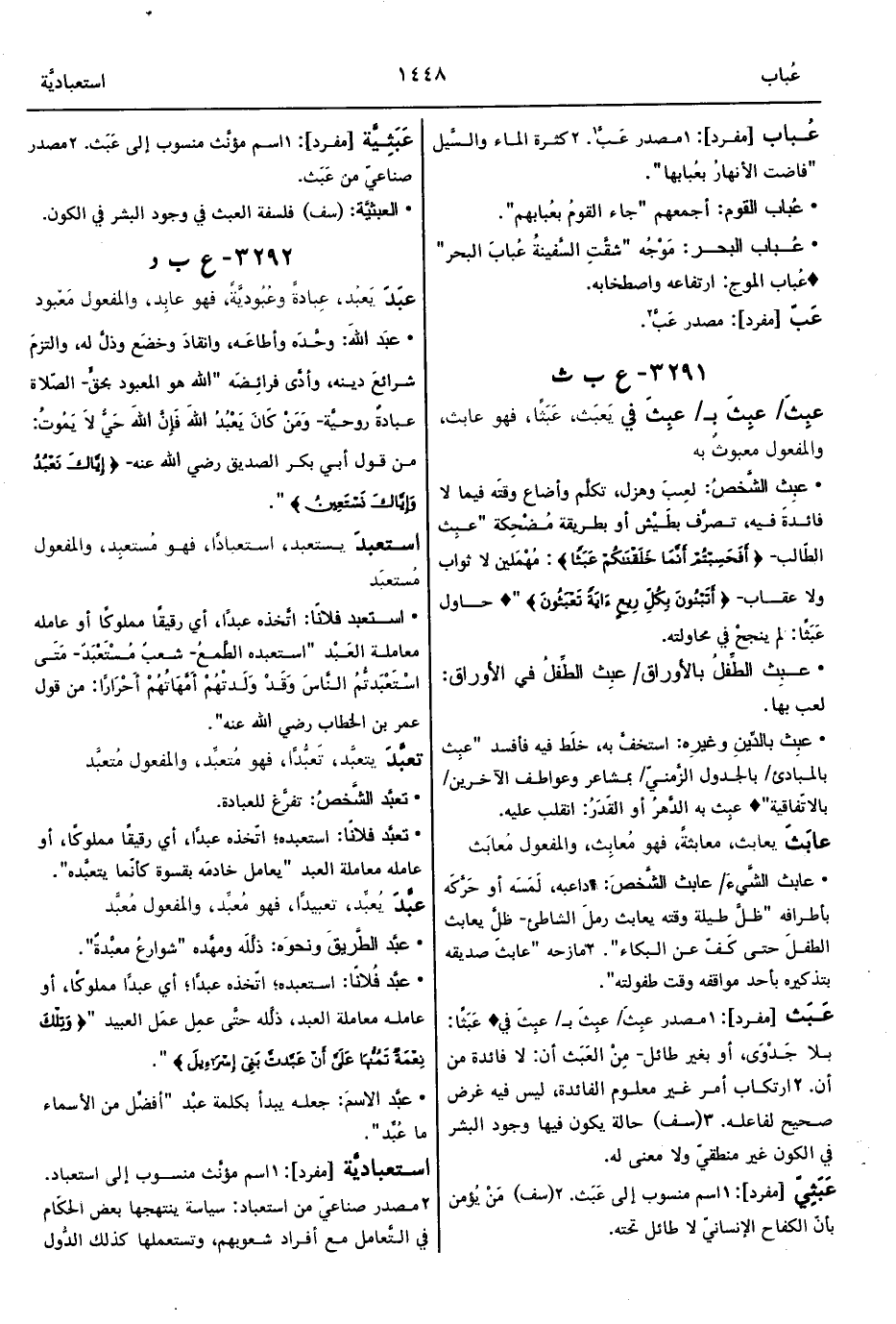 • عبَد اللهَ: وحَّدَه وأطاعَه، وانقادَ وخضَع وذلَّ له، والتزمَ شرائعَ دينه، وأدَّى فرائِضَه "الله هو المعبود بحقٍّ- الصّلاة عبادةٌ روحيَّة- وَمَنْ كَانَ يَعْبُدُ اللهَ فَإِنَّ اللهَ حَيٌّ لاَ يَمُوتُ: من قول أبي بكر الصديق رضي الله عنه- {إِيَّاكَ نَعْبُدُ وَإِيَّاكَ نَسْتَعِينُ} ".