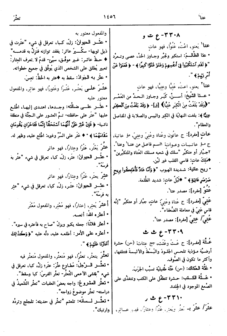 • عثَر الحيوانُ: زلّ، كبا، تعرقل في شيء "عثَرت في ذيل ثوبها- سكِّيرٌ عاثر: يفقد توازنه فتَزِلَّ به قدمه" ° حظّ عاثر: غير موفَّق، سيِّئ- قدمٌ لا تعرف العِثار: تعبير يُطلق على الشخص الذي يُوفَّق في جميع خطواته.