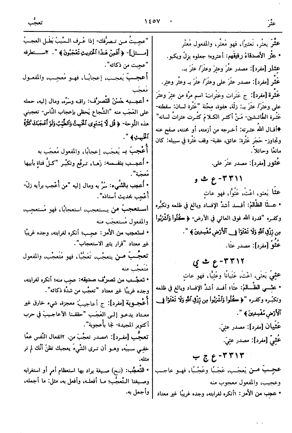 1 - أنكره لغرابته، وجده غريبًا غير معتاد "عجِبتُ من تصرُّفك- إذا عُرِف السَّببُ بَطَل العجبُ [مثل]- {أَفَمِنْ هَذَا الْحَدِيثِ تَعْجَبُونَ} ".