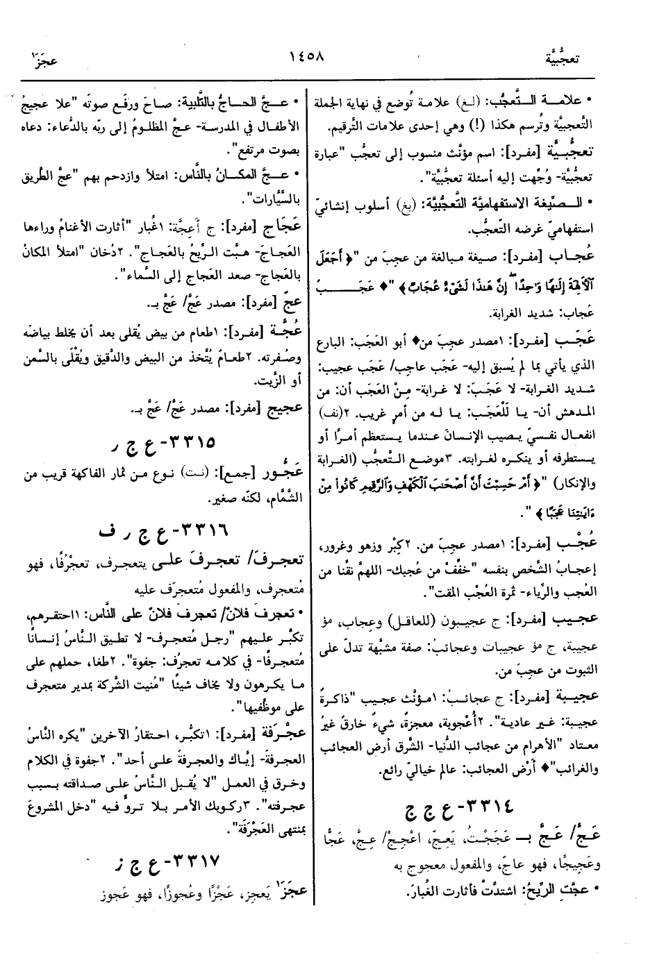 • عجَّ الحاجُّ بالتَّلبية: صاحَ ورفَع صوتَه "علا عجيجُ الأطفال في المدرسة- عجَّ المظلومُ إلى ربّه بالدُّعاء: دعاه بصوت مرتفع".
