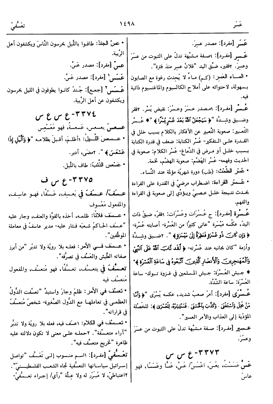 2 - ضيق وشِدَّة وأزمة "كان بجانبه عند عُسْرته- {لَقَدْ تَابَ اللهُ عَلَى النَّبِيِّ وَالْمُهَاجِرِينَ وَالأَنْصَارِ الَّذِينَ اتَّبَعُوهُ فِي سَاعَةِ الْعُسْرَةِ} " ° جيش العُسْرَة: جيش المسلمين في غزوة تبوك- ساعة العُسْرَة: ساعة الشِّدَّة.