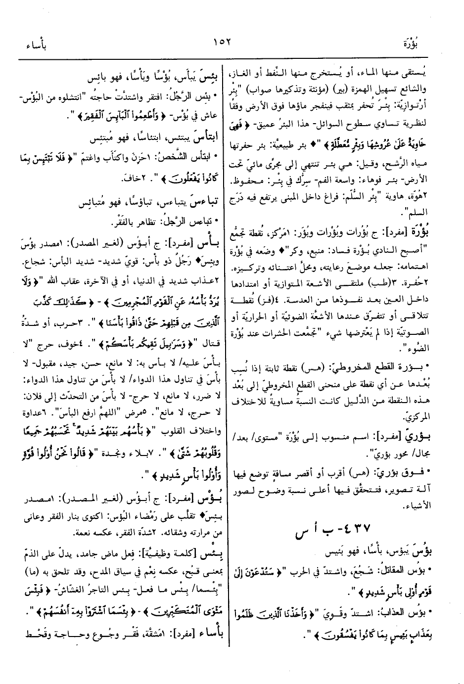 • بؤُس العذابُ: اشتدّ وقَوِيَ " {وَأَخَذْنَا الَّذِينَ ظَلَمُوا بِعَذَابٍ بَئِيسٍ بِمَا كَانُوا يَفْسُقُونَ} ".