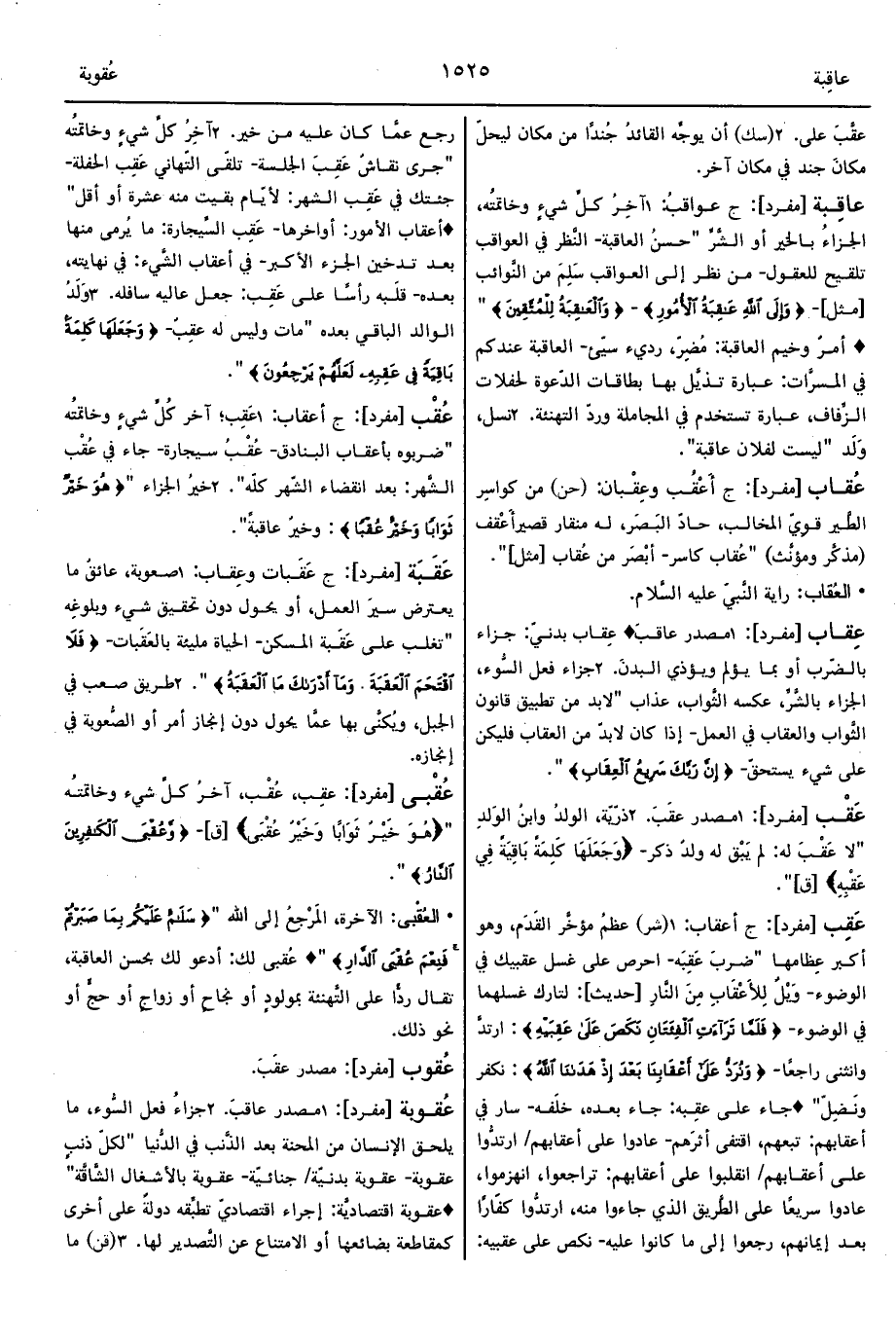 1 - آخِرُ كلِّ شيءٍ وخاتمتُه، الجزاءُ بالخير أو الشَّرِّ "حسنُ العاقبة- النَّظر في العواقب تلقيح للعقول- من نظر إلى العواقب سَلِمَ من النَّوائب [مثل]- {وَإِلَى اللهِ عَاقِبَةُ الأُمُورِ} - {وَالْعَاقِبَةُ لِلْمُتَّقِينَ} " ° أمرٌ وخيم العاقبة: مُضِرّ، رديء سيّئ- العاقبة عندكم في المسرَّات: عبارة تذيَّل بها بطاقات الدّعوة لحفلات الزِّفاف، عبارة تستخدم في المجاملة وردّ التهنئة.