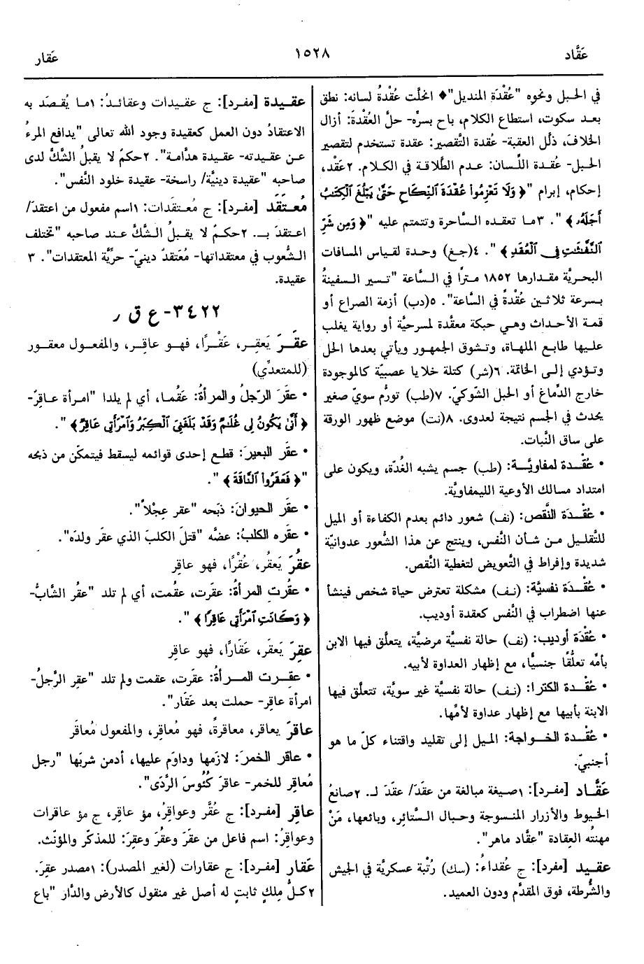 • عقُرتِ المرأةُ: عقَرت، عقُمت، أي لم تلد "عقُر الشَّابُّ- {وَكَانَتِ امْرَأَتِي عَاقِرًا} ".