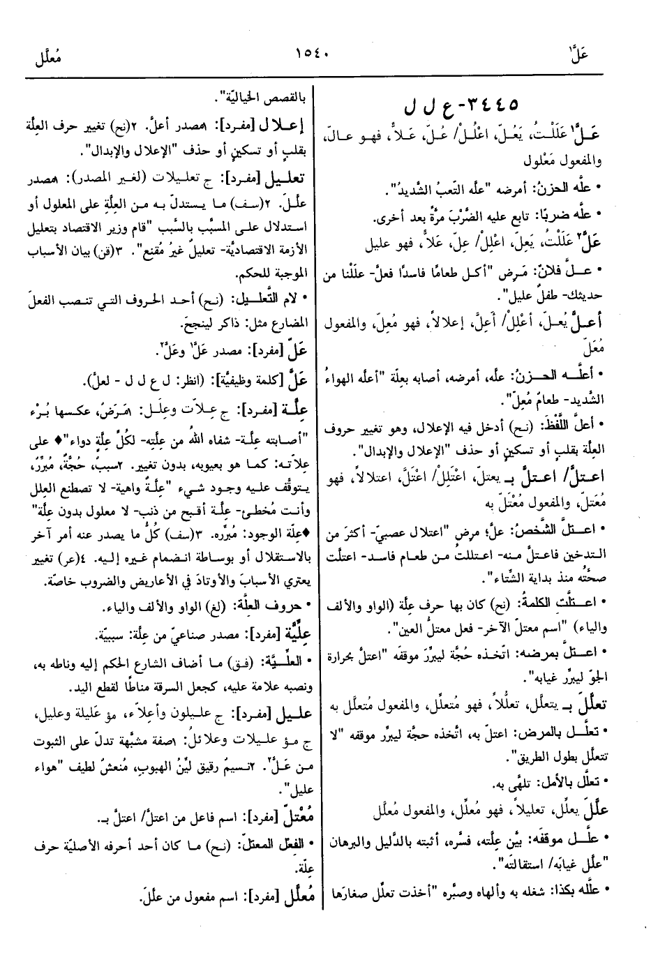 1 - مَرَضٌ، عكسها بُرْء "أصابته عِلَّة- شفاه اللهُ من عِلَّتِه- لكُلِّ عِلَّةٍ دواء" ° على عِلاّته: كما هو بعيوبه، بدون تغيير.