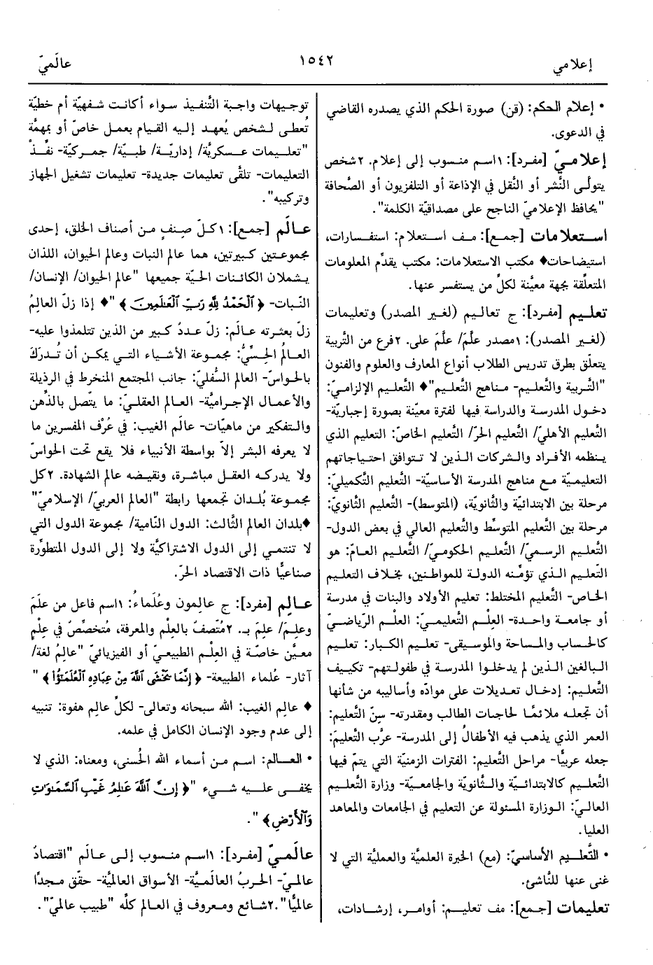 1 - كلّ صِنفٍ من أصناف الخلق، إحدى مجموعتين كبيرتين، هما عالم النبات وعالم الحيوان، اللذان يشملان الكائنات الحيّة جميعها "عالم الحيوان/ الإنسان/ النّبات- {الْحَمْدُ لِلَّهِ رَبِّ الْعَالَمِينَ} " ° إذا زلّ العالِمُ زلّ بعثرته عالَم: زلّ عددٌ كبير من الذين تتلمذوا عليه- العالمُ الحِسِّيُّ: مجموعة الأشياء التي يمكن أن تُدرَكَ بالحواسّ- العالم السُّفليّ: جانب المجتمع المنخرط في الرذيلة والأعمال الإجراميَّة- العالم العقليّ: ما يتّصل بالذِّهن والتفكير من ماهيّات- عالَم الغيب: في عُرْف المفسرين ما لا يعرفه البشر إلاّ بواسطة الأنبياء فلا يقع تحت الحواسّ ولا يدركه العقل مباشرة، ونقيضه عالم الشهادة.