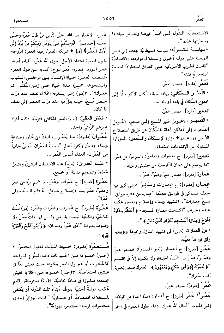 2 - تشييد وبناء وإصلاح وتعمير، عكْسه هدم وخراب "اكتملت عِمارة المسجد- {أَجَعَلْتُمْ سِقَايَةَ الْحَاجِّ وَعِمَارَةَ الْمَسْجِدِ الْحَرَامِ كَمَنْ ءَامَنَ} ".