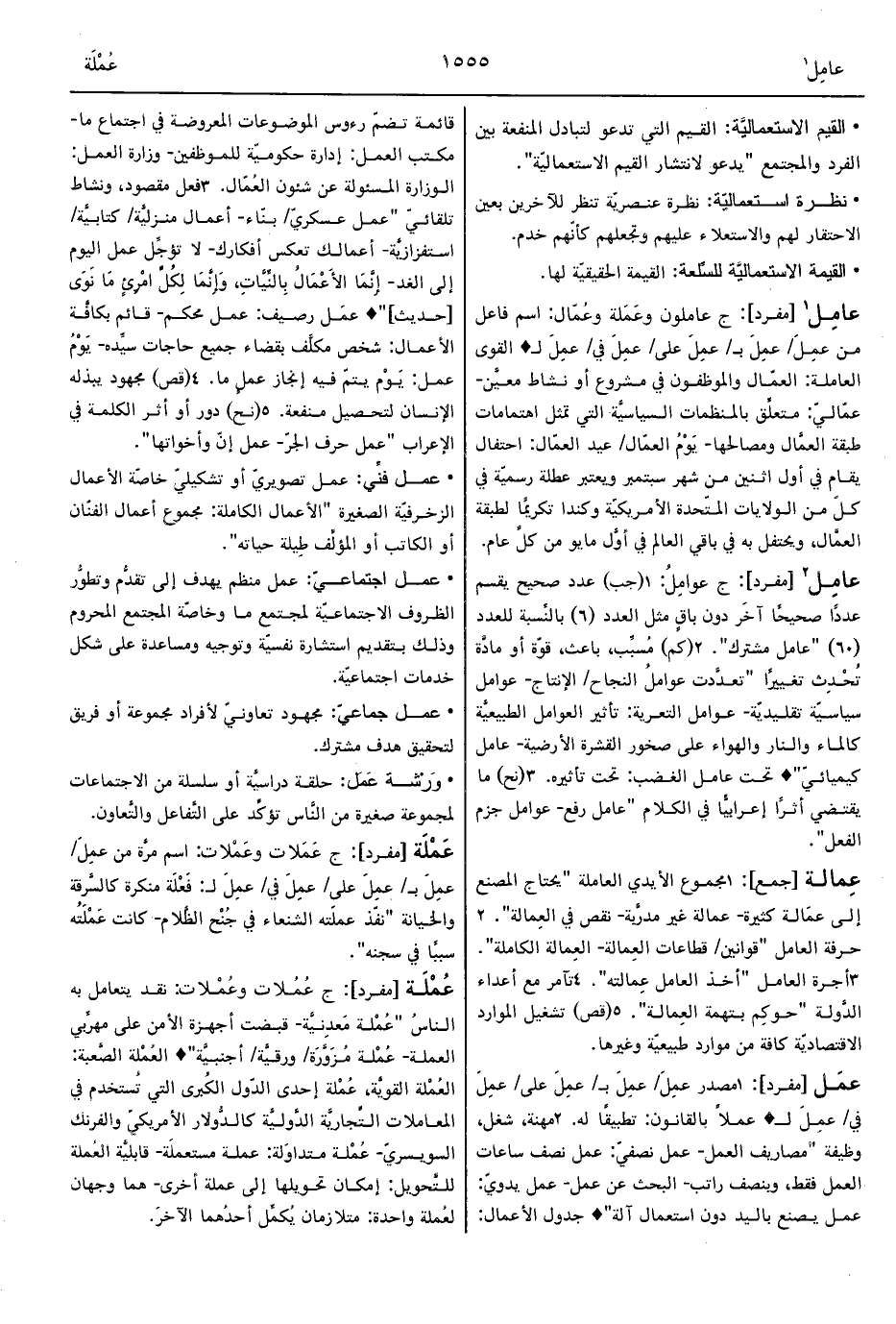 عامِل1 [مفرد]: ج عاملون وعَمَلة وعُمّال: اسم فاعل من عمِلَ/ عمِلَ بـ/ عمِلَ على/ عمِلَ في/ عمِلَ لـ ° القوى العاملة: العمّال والموظفون في مشروع أو نشاط معيَّن- عمّاليّ: متعلِّق بالمنظمات السياسيَّة التي تمثل اهتمامات طبقة العمَّال ومصالحها- يَوْمُ العمّال/ عيد العمّال: احتفال يقام في أول اثنين من شهر سبتمبر ويعتبر عطلة رسميّة في كلّ من الولايات المتّحدة الأمريكيّة وكندا تكريمًا لطبقة العمَّال، ويحتفل به في باقي العالم في أوَّل مايو من كلِّ عام.