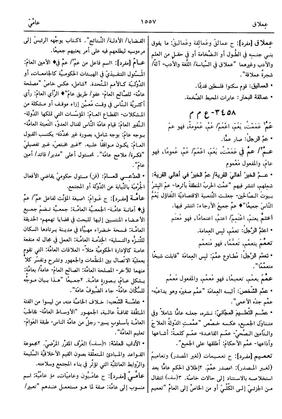 2 - شامل، عكس خاصّ "مصلحة عامَّة- للصَّالح العامّ- عفو/ طريق عامّ" ° النَّفير العامّ: قيام عامّة النَّاس لقتال العدوّ، التّعبئة العامَّة- الرَّأي العامّ: رأي أكثريَّة النَّاس في وقت مُعيَّن إزاء موقف أو مشكلة من المشكلات- القطاع العامّ: المؤسّسات التي تملكها الدَّولة- بوجه عامّ: بوجه شامل، بصورة غير محدَّدَة- يكتسب القبول العامّ: يكون موافقًا عليه.