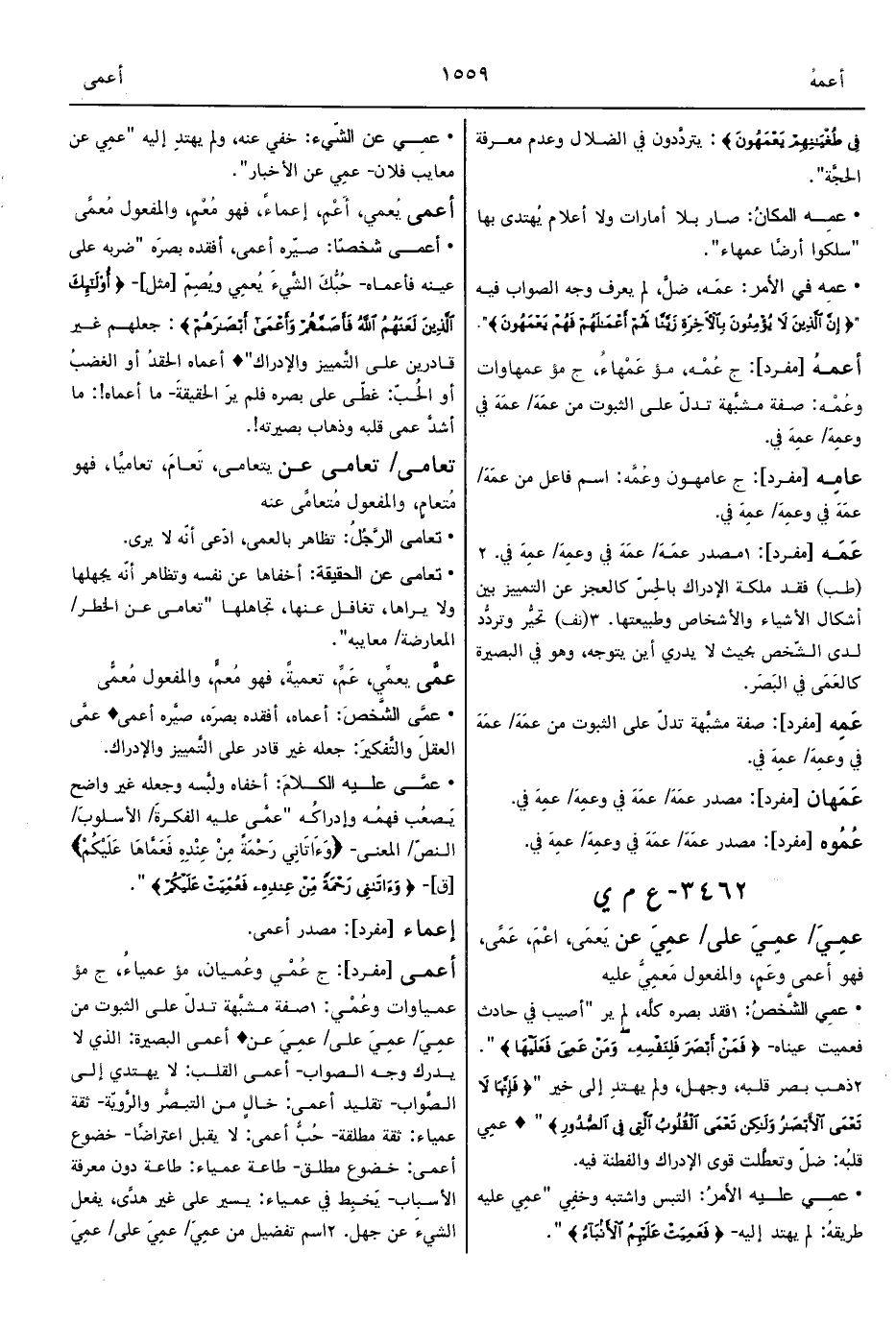 • عمِي عليه الأمرُ: التبس واشتبه وخفِي "عمِي عليه طريقهُ: لم يهتد إليه- {فَعَمِيَتْ عَلَيْهِمُ الأَنْبَاءُ} ".