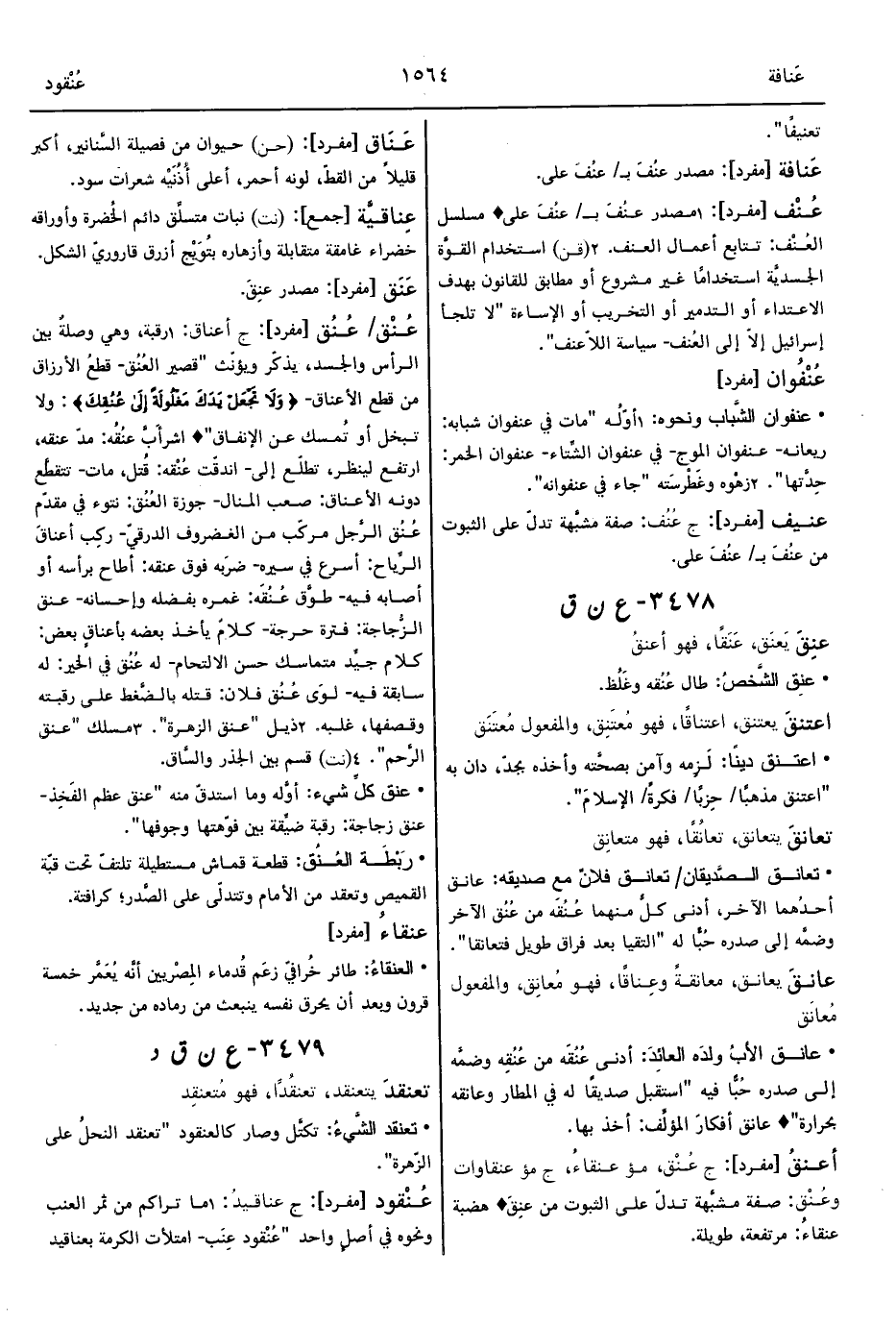 أعنقُ [مفرد]: ج عُنْق، مؤ عنقاءُ، ج مؤ عنقاوات وعُنْق: صفة مشبَّهة تدلّ على الثبوت من عنِقَ ° هضبة عنقاءُ: مرتفعة، طويلة.
