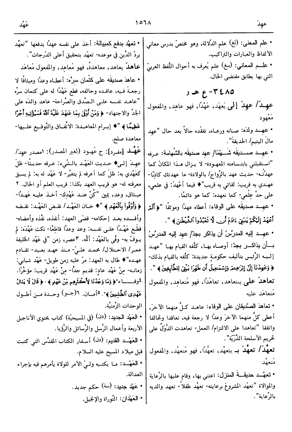 2 - ميثاق، وعد، يمين "كُنْ عند عَهْدِك- أخذ عليه عَهدًا- {وَأَوْفُوا بِالْعَهْدِ} " ° خان العَهْد/ نقض العَهْد: نقضه وأفسده بعد إحكامه- قضَى العهد: أنفذه، نفَّذه وأمضاه- قطَع عَهْدًا على نفسه: وعد وعدًا قاطِعًا- نكث عَهْدَه: لم يوفّ به- وفَّى بالعَهْد: أتمَّه.