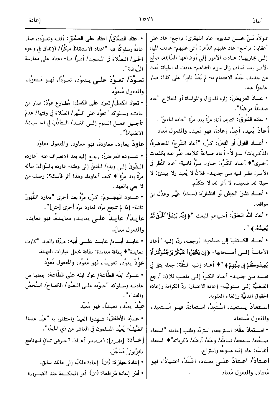 • أعاد الكتابَ إلى صاحبه: أرجعه، ردّه إليه "أعاد الأمانةَ إلى أصحابها- {إِنْ يَظْهَرُوا عَلَيْكُمْ يَرْجُمُوكُمْ أَوْ يُعِيدُوكُمْ فِي مِلَّتِهِمْ} "? أعاد إليه الثِّقَة: جعله يثق في نفسه من جديد- أعاد الكرةَ إلى ملعب فلان: أرجع القضيَّة إلى مسئوليّته- إعادة الاعتبار: ردّ الكرامة وإعادة الحقوق المدنيَّة وإلغاء العقوبة.