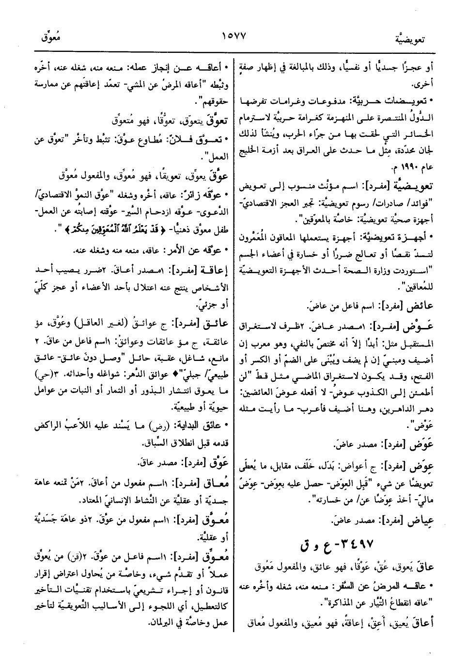 • عوَّقَه زائرٌ: عاقه، أخَّره وشغله "عوَّق النموَّ الاقتصاديّ/ الدَّعوى- عوَّقه ازدحام السَّير- عوَّقته إصابتُه عن العمل- طفل معوَّق ذهنيًّا- {قَدْ يَعْلَمُ اللهُ الْمُعَوِّقِينَ مِنْكُمْ} ".
