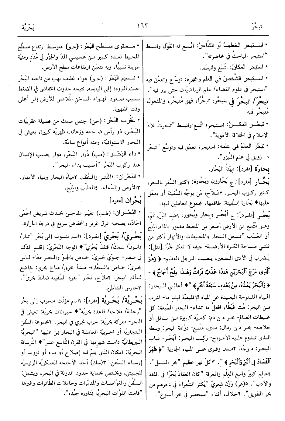 1 - ضِد البَرّ، يَمّ، وهو مُتَّسع من الأرض أصغر مِن المحيط مغمور بالماء المِلْح أو العَذب "تشغل البحار والمحيطات والأنهار أكثر من ثلثي مساحة الكرة الأرضية- جيفة لا تعكر بحْرًا [مثل]: يُضرب في الأذى الصغير، يصيب الرجل العظيم- {وَهُوَ الَّذِي مَرَجَ الْبَحْرَيْنِ هَذَا عَذْبٌ فُرَاتٌ وَهَذَا مِلْحٌ أُجَاجٌ} - {وَالْبَحْرُ يَمُدُّهُ مِنْ بَعْدِهِ سَبْعَةُ أَبْحُرٍ} " ° أعالي البحار: المياه المفتوحة البعيدة عن المياه الإقليميّة لبلدٍ ما- اشرب من البحر: مُت غَيْظًا، افعلْ ما تشاء- البحار السَّبعة: كل محيطات العالم- بحر من دم: كميّة كبيرة من سائل أو خلافه- بحر من رمال: مدى، متّسع- دوَّامة البحر: وسطه الذي تدوم عليه الأمواج- ركِب البحر: أَبْحَر- عُباب البحر: موجُه.