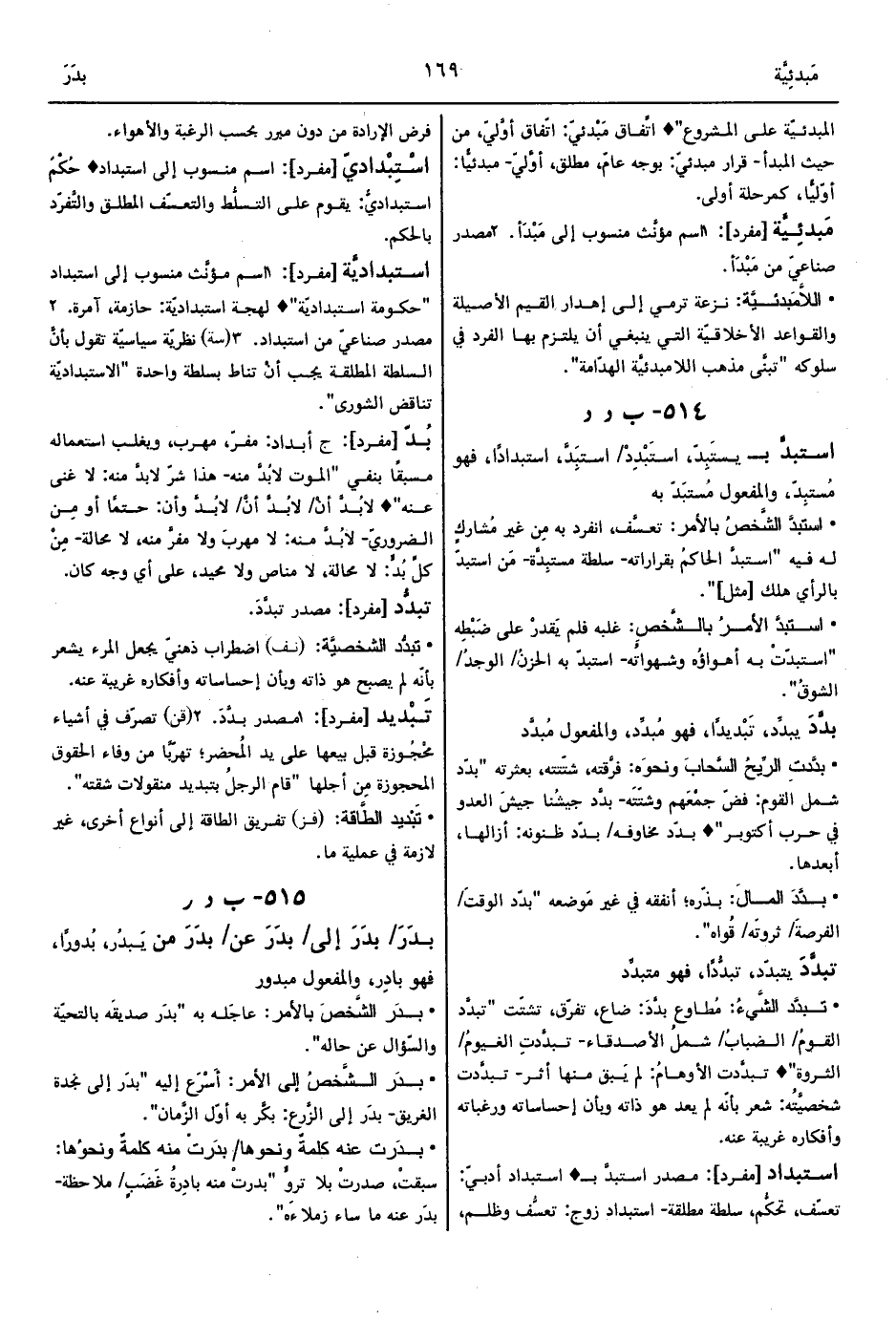 • استبدَّ الشَّخصُ بالأمر: تعسَّف، انفرد به مِن غير مُشاركٍ له فيه "استبدَّ الحاكمُ بقراراته- سلطة مستبِدَّة- مَن استبدّ بالرأي هلك [مثل] ".