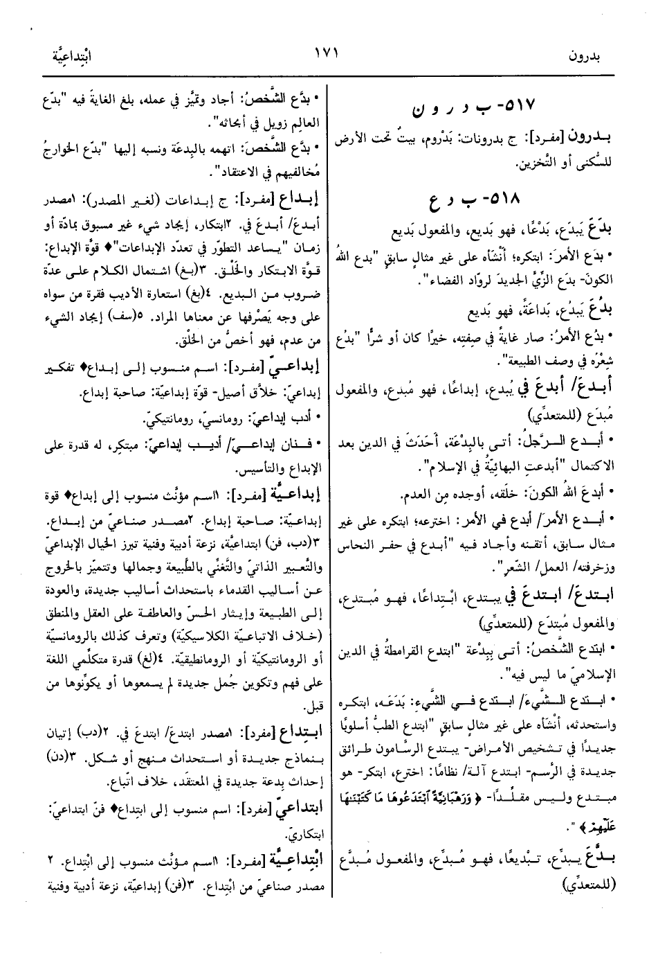 • بدَع الأمرَ: ابتكره؛ أَنْشَأه على غير مثالٍ سابقٍ "بدع اللهُ الكونَ- بدَع الزِّيَّ الجديدَ لروّاد الفضاء".