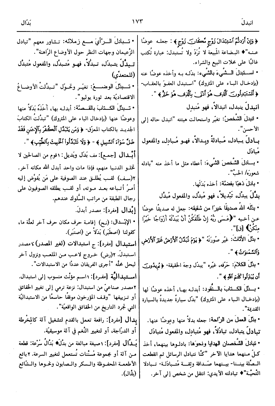 • بدَّلَ الأثاثَ: غيّر صُورَتَهُ " {يَوْمَ تُبَدَّلُ الأَرْضُ غَيْرَ الأَرْضِ وَالسَّمَوَاتُ} ".