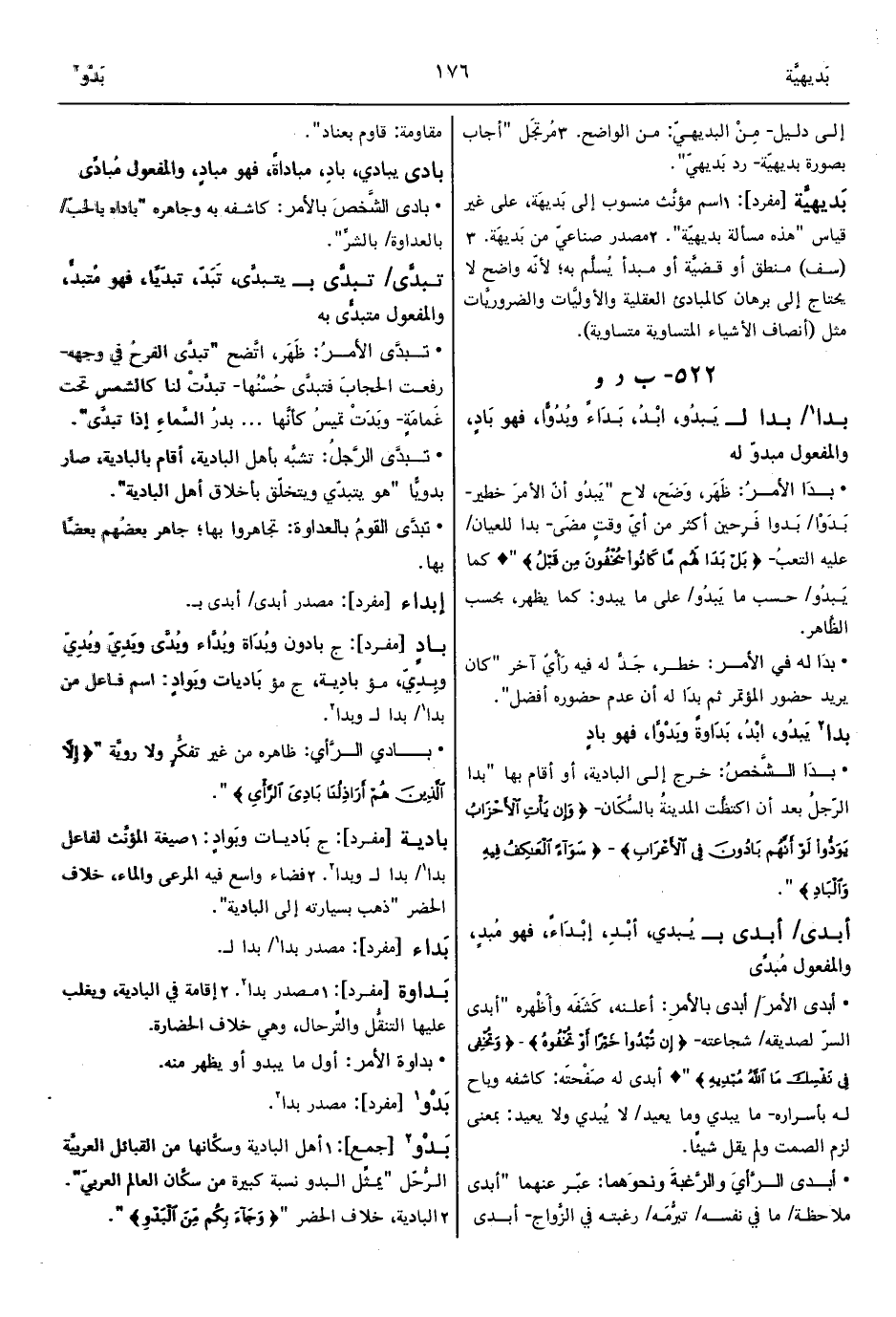 • بدَا الشَّخصُ: خرج إلى البادية، أو أقام بها "بدا الرّجلُ بعد أن اكتظَّت المدينةُ بالسُّكّان- {وَإِنْ يَأْتِ الأَحْزَابُ يَوَدُّوا لَوْ أَنَّهُمْ بَادُونَ فِي الأَعْرَابِ} - {سَوَاءً الْعَاكِفُ فِيهِ وَالْبَادِ} ".