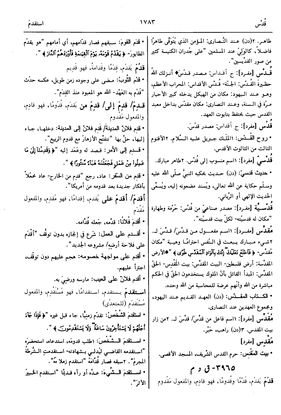 • قدِم إلى الأمر: قصد له وعَمَد إليه " {وَقَدِمْنَا إِلَى مَا عَمِلُوا مِنْ عَمَلٍ فَجَعَلْنَاهُ هَبَاءً مَنْثُورًا} ".