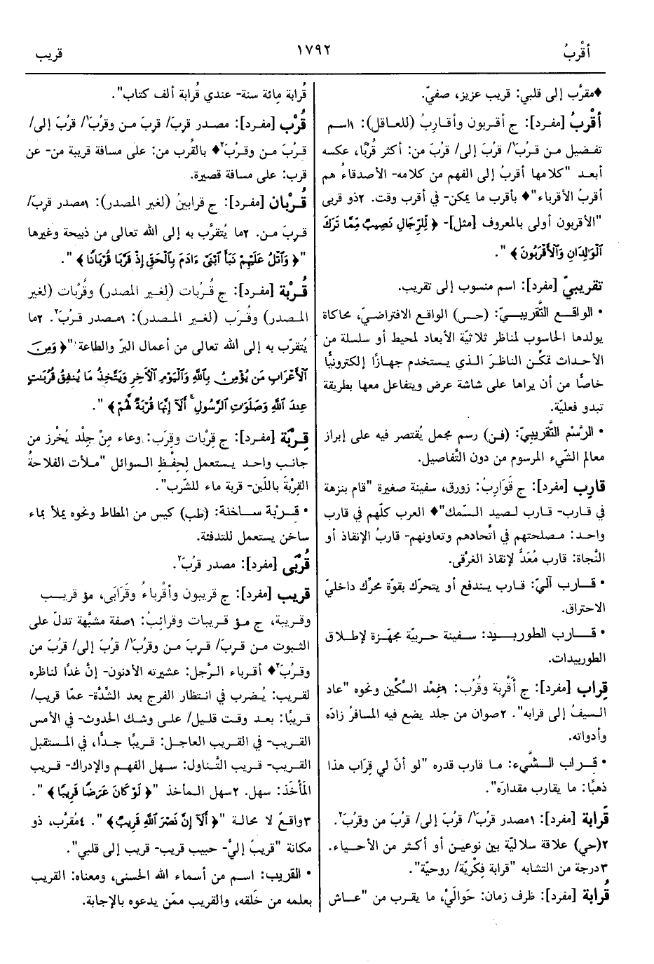 1 - صفة مشبَّهة تدلّ على الثبوت من قرِبَ/ قرِبَ من وقرُبَ1/ قرُبَ إلى/ قرُبَ من وقرُبَ2 ° أقرباء الرَّجل: عشيرته الأدنون- إنَّ غدًا لناظره لقريب: يُضرب في انتظار الفرج بعد الشِّدَّة- عمّا قريب/ قريبًا: بعد وقت قليل/ على وشك الحدوث- في الأمس القريب- في القريب العاجل: قريبًا جدًّا، في المستقبل القريب- قريب التَّناول: سهل الفهم والإدراك- قريب المَأْخَذ: سهل.
