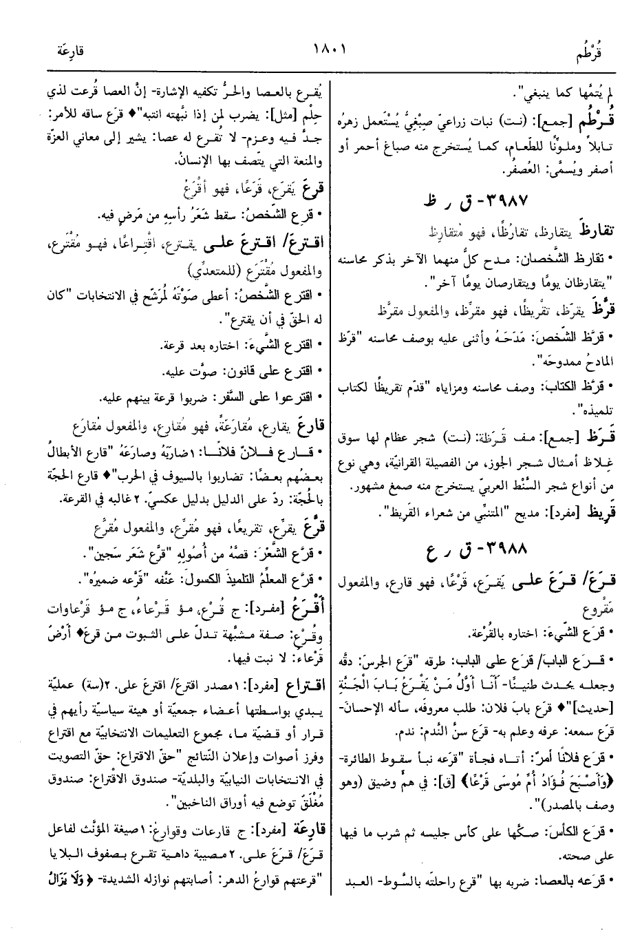 • قارعة الطّريق: وسطه، معظمه "وقف يكلّمه في قارعة الطّريق- أوقف سيّارته في قارعة الطّريق".