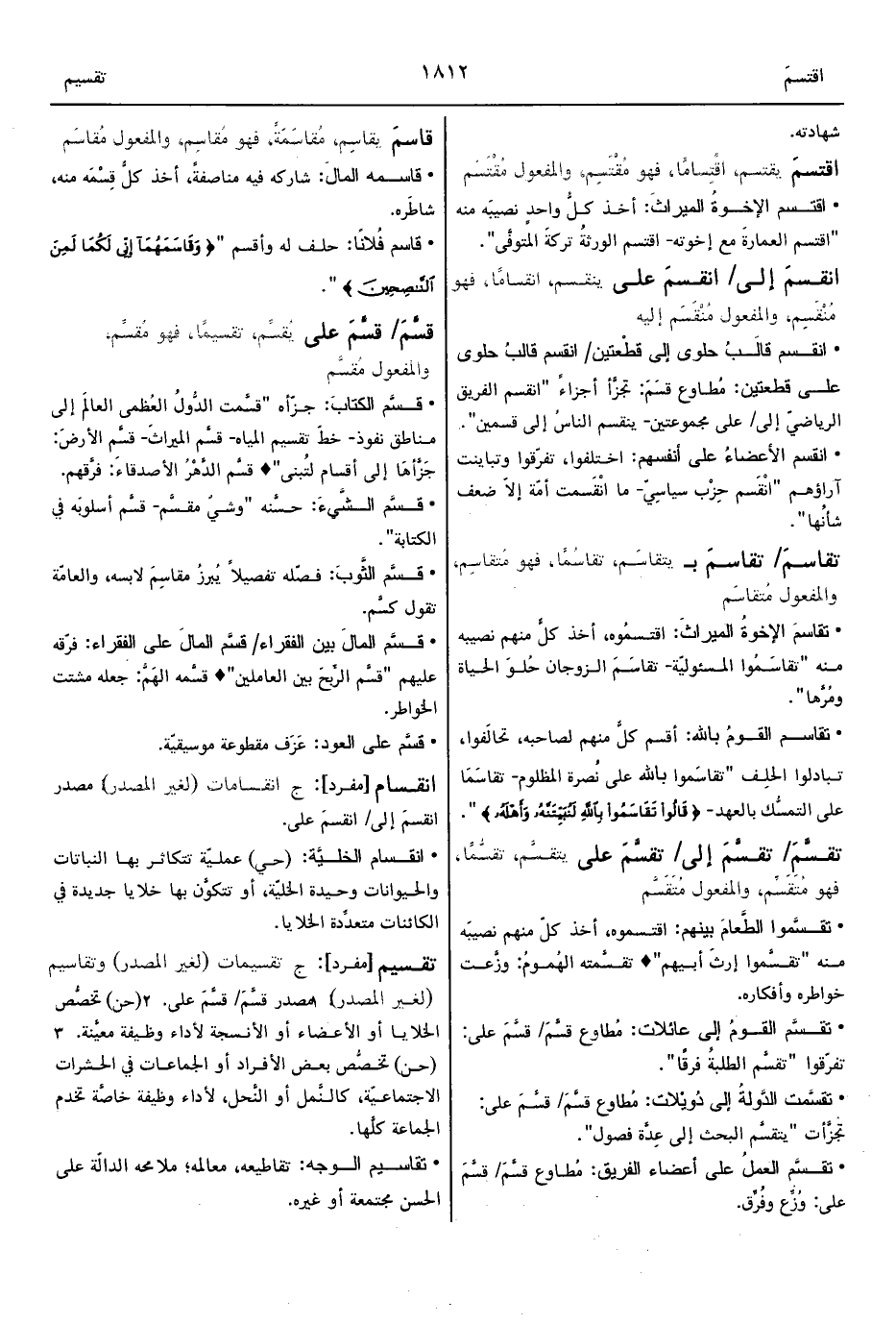 • قاسم فُلانًا: حلف له وأقسم " {وَقَاسَمَهُمَا إِنِّي لَكُمَا لَمِنَ النَّاصِحِينَ} ".