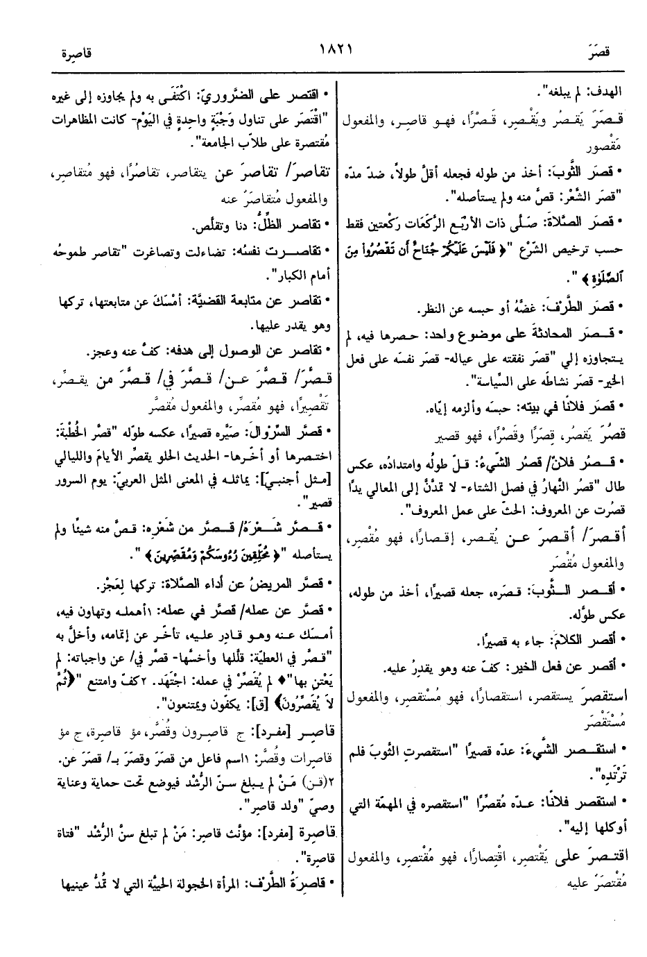 • قصَر الصَّلاةَ: صَلَّى ذات الأرْبَع الرَّكَعَات رَكْعتين فقط حسب ترخيص الشّرْع " {فَلَيْسَ عَلَيْكُمْ جُنَاحٌ أَنْ تَقْصُرُوا مِنَ الصَّلاَةِ} ".