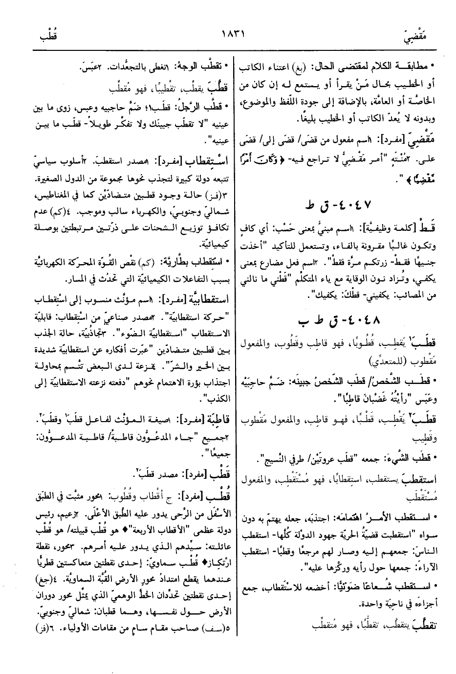 4 - (جغ) إحدى نقطتين تحدِّدان الخطَّ الوهميّ الذي يمثِّل محور دوران الأرض حول نفسها، وهما قطبان: شماليّ وجنوبيّ.