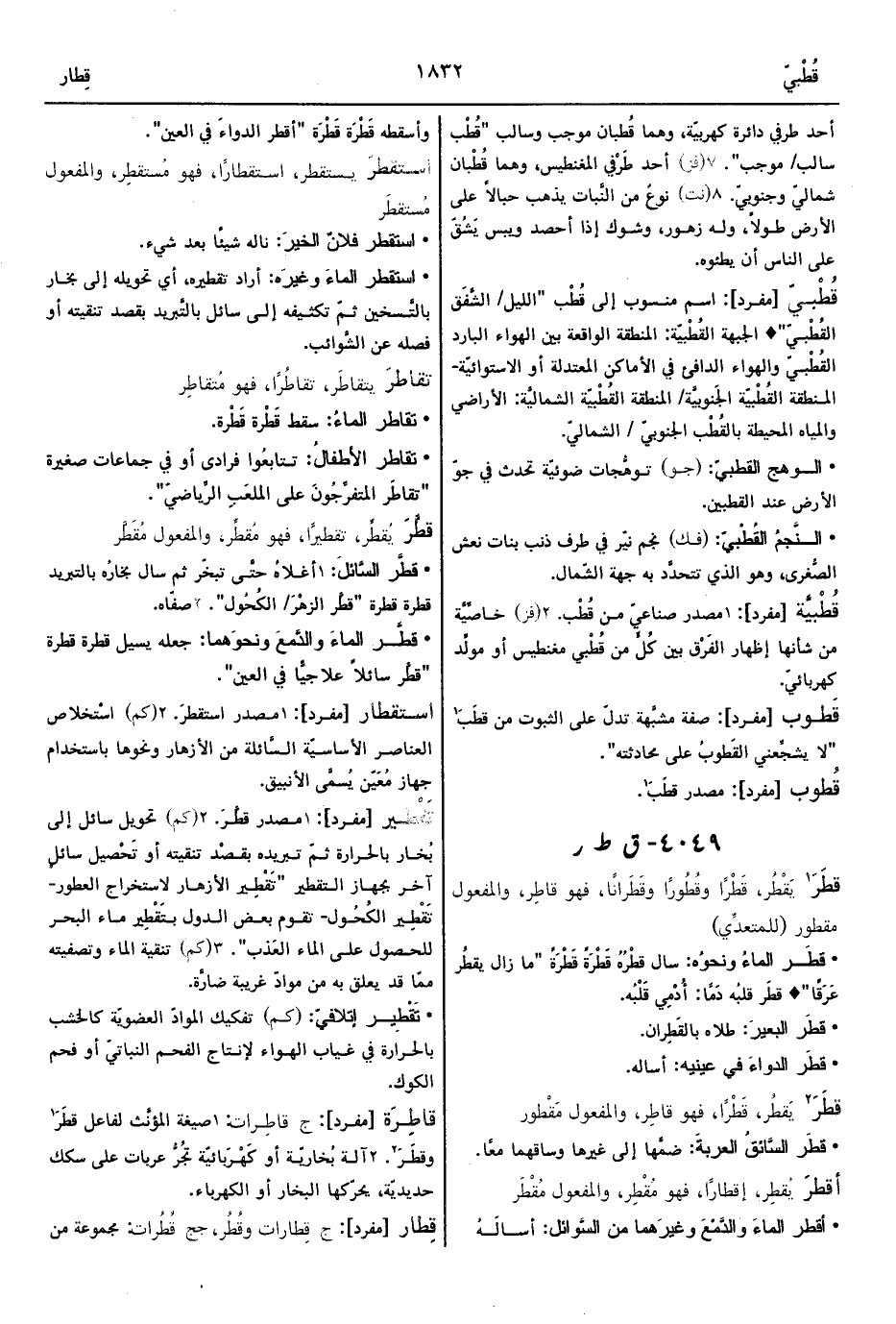 -[1833]- عَرَبات السِّكَّة الحديديّة تجرُّها قاطِرَة، تنقل الناسَ والبضائعَ "قِطار رُكَّاب/ سريع / سباق/ بضائع/ سكة حديد- زادت حوادث القِطارات في الآونة الأخيرة" ° فاتَها قِطارُ الزَّواج: فاتتها فرصة الزّواج- فاتَهُ القِطارُ: تأخّر، وصل بعد فوات الأوان، ضاعت الفرصة عليه.