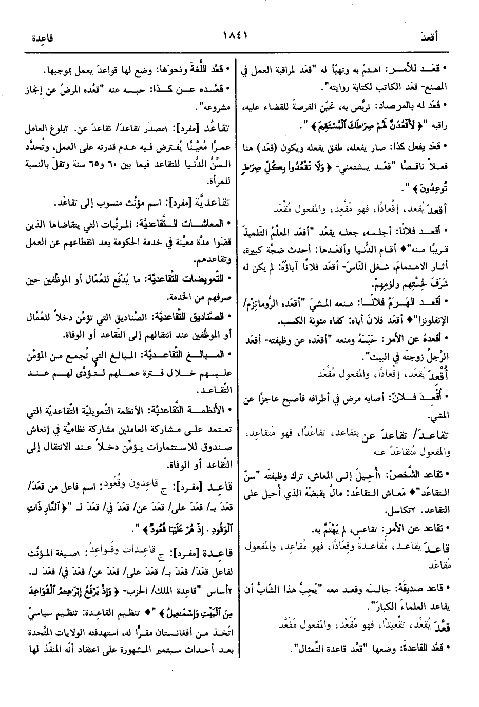 • قاعد صديقَهُ: جالسَه وقعد معه "يُحِبُّ هذا الشّابُّ أن يقاعد العلماءَ الكبارَ".