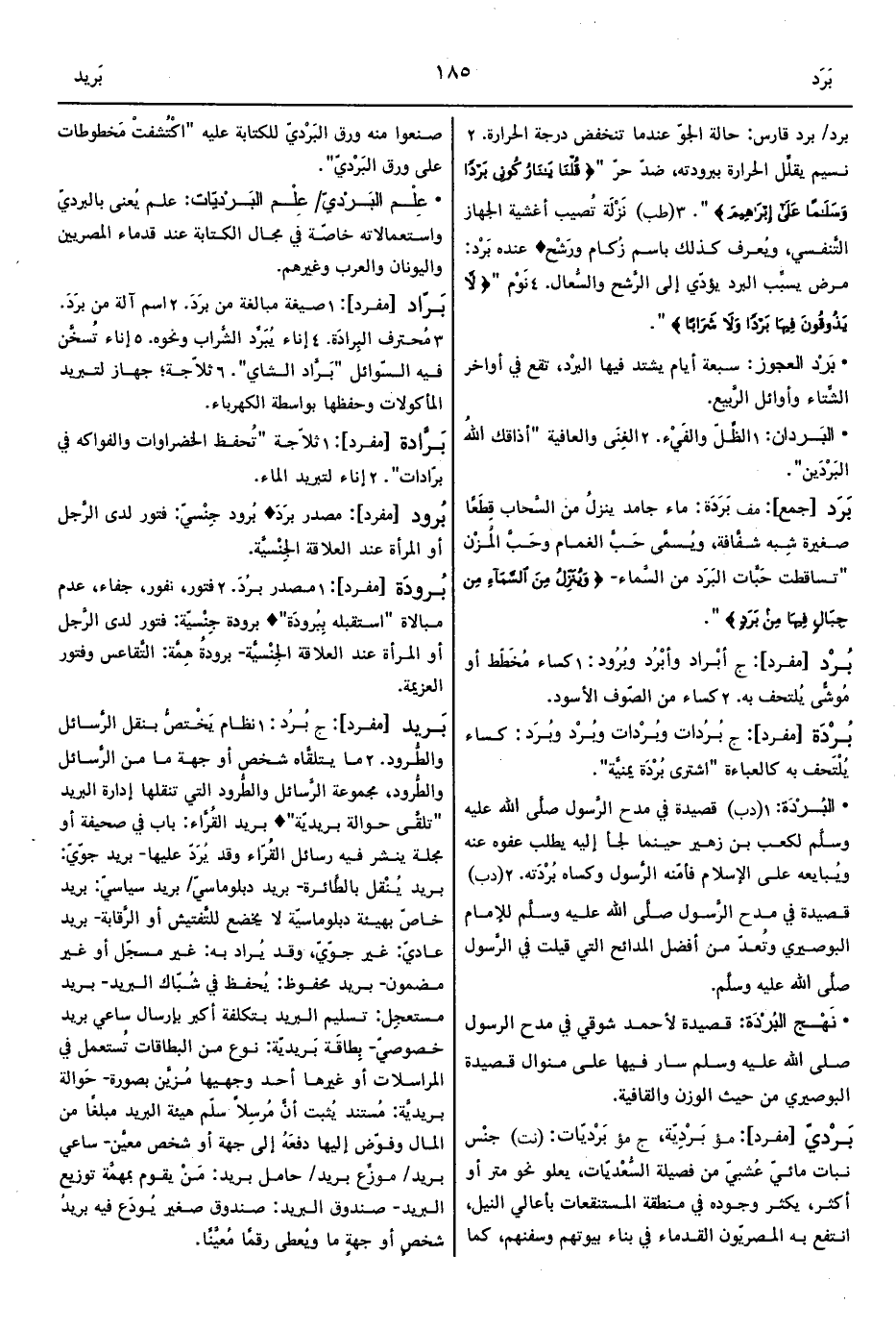 2 - ما يتلقَّاه شخص أو جهة ما من الرَّسائل والطُّرود، مجموعة الرَّسائل والطُّرود التي تنقلها إدارة البريد "تلقَّى حوالة بريديّة" ° بريد القُرَّاء: باب في صحيفة أو مجلة ينشر فيه رسائل القُرّاء وقد يُرَدّ عليها- بريد جوّيّ: بريد يُنْقل بالطَّائرة- بريد دبلوماسيّ/ بريد سياسيّ: بريد خاصّ بهيئة دبلوماسيّة لا يخضع للتَّفتيش أو الرَّقابة- بريد عاديّ: غير جوّيّ، وقد يُراد به: غير مسجّل أو غير مضمون- بريد محفوظ: يُحفظ في شُبّاك البريد- بريد مستعجِل: تسليم البريد بتكلفة أكبر بإرسال ساعي بريد خصوصيّ- بِطاقَة بَريديّة: نوع من البطاقات تُستعمل في المراسلات أو غيرها أحد وجهيها مُزيَّن بصورة- حَوالة بريديَّة: مُستند يُثبت أنَّ مُرسِلاً سلّم هيئة البريد مبلغًا من المال وفوّض إليها دفعَهُ إلى جهة أو شخص معيَّن- ساعي بريد/ موزِّع بريد/ حامل بريد: مَنْ يقوم بمهمَّة توزيع البريد- صندوق البريد: صندوق صغير يُودَع فيه بريدُ شخصٍٍ أو جهةٍ ما ويُعطى رقمًا مُعيَّنًا.