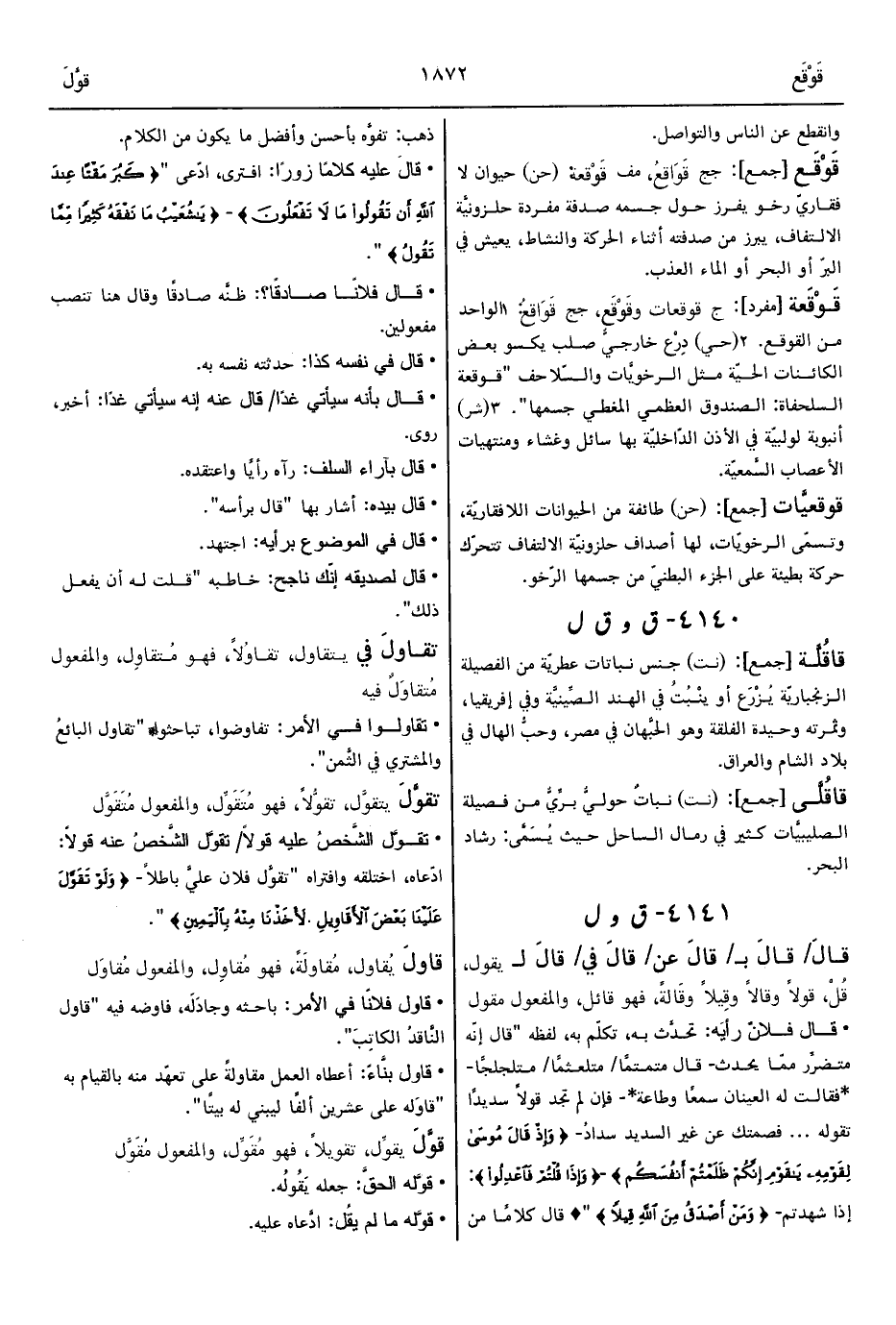 قالَ/ قالَ بـ/ قالَ عن/ قالَ في/ قالَ لـ يقول، قُلْ، قولاً وقالاً وقِيلاً وقَالةً، فهو قائل، والمفعول مقول