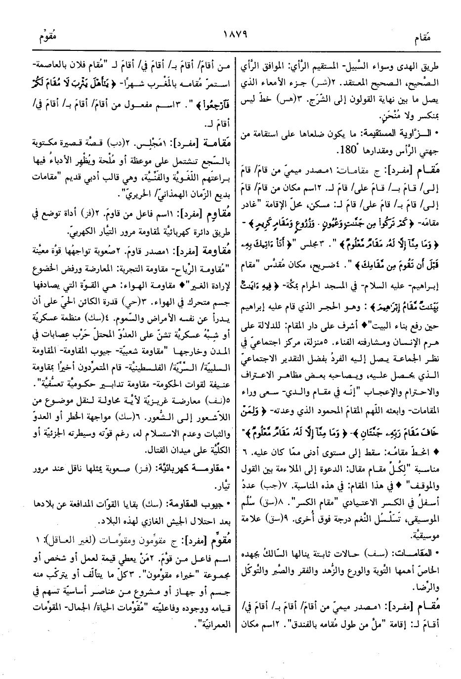 4 - ضريح، مكان مُقدَّس "مقام إبراهيم- عليه السلام- في المسجد الحرام بمكَّة- {فِيهِ ءَايَاتٌ بَيِّنَاتٌ مَقَامُ إِبْرَاهِيمَ}: وهو الحجر الذي قام عليه إبراهيم حين رفع بناء البيت" ° أشرف على دار المقام: للدلالة على هرم الإنسان ومشارفته الفناء.