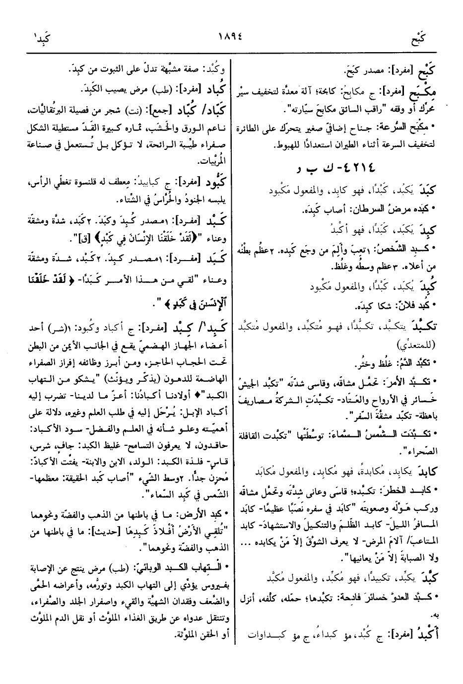 2 - كَبْد، شدّة ومشقّة وعناء "لقي من هذا الأمر كَبَدًا- {لَقَدْ خَلَقْنَا الإِنْسَانَ فِي كَبَدٍ} ".