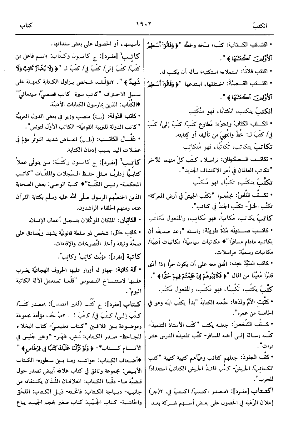2 - صُحُف مؤلَّفة مجموعة وموضوعة بين غلافين "كتاب تعليميّ- كتاب البخلاء للجاحظ- صدر الكتاب: نُشِر، ظهَر- *وخير جَليس في الأنام كتاب*- {وَلَوْ نَزَّلْنَا عَلَيْكَ كِتَابًا فِي قِرْطَاسٍ} " ° أضعاف الكِتاب: حواشيه وما بين سطوره- الكتاب الأبيض: مجموعة وثائق في كتاب غلافه أبيض تصدر حول قضيَّة ما- دفّتا الكتاب: الغلافان اللّذان يكتنفانه من جانبيه- ديباجة الكتاب: فاتحته- ذيل الكتاب: الملحَق والحاشية- كتاب الجَيْب: كتاب صغير بحجم الجيب، يباع