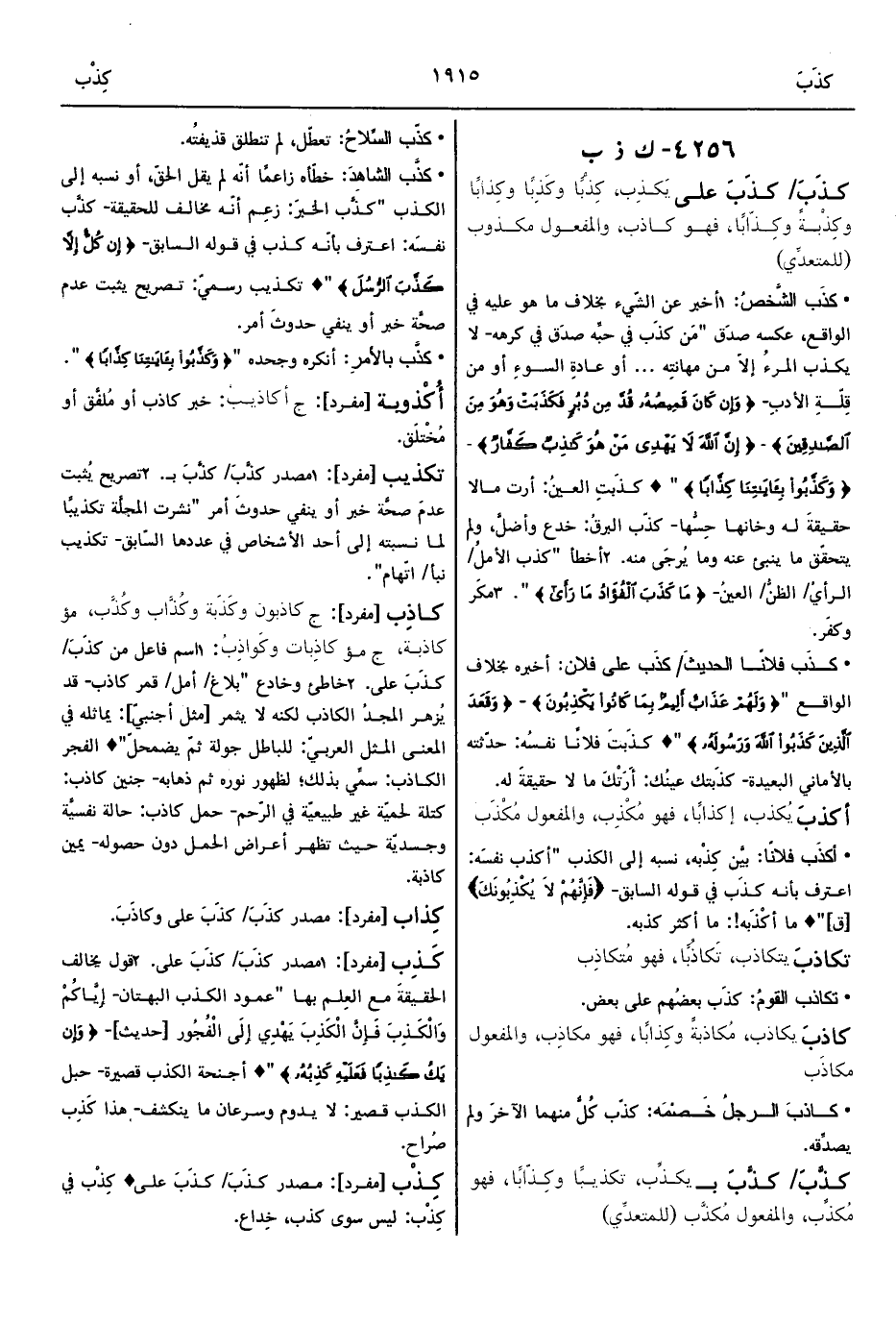 • كذَّب بالأمرِ: أنكره وجحده " {وَكَذَّبُوا بِآيَاتِنَا كِذَّابًا} ".
