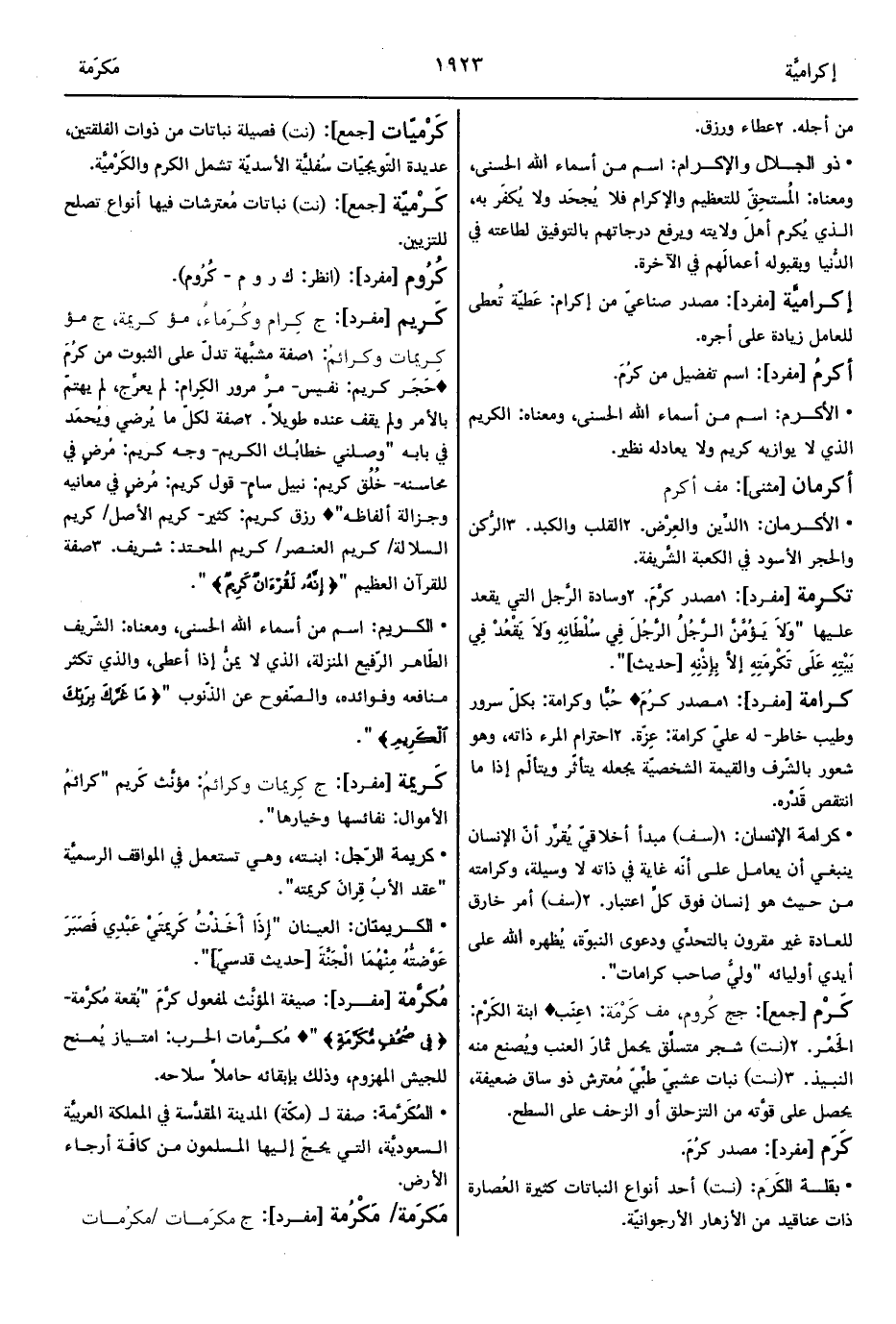 1 - صفة مشبَّهة تدلّ على الثبوت من كرُمَ ° حَجَر كريم: نفيس- مرَّ مرور الكِرام: لم يعرِّج، لم يهتمّ بالأمر ولم يقف عنده طويلاً.