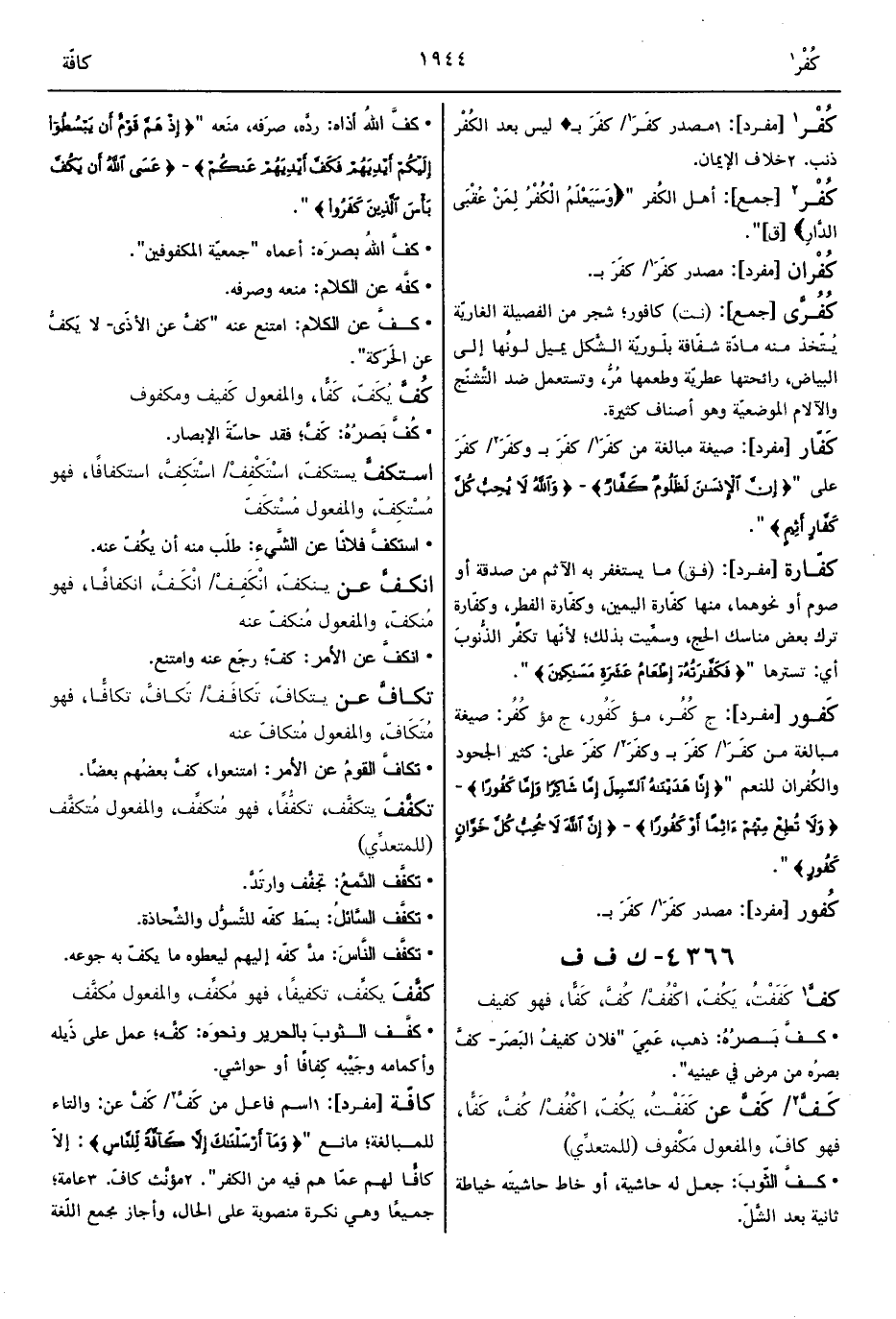 -[1945]- المصري تعريفها "أوصى بأمواله كافَّة للفقراء: كامِلة، كُلّها- حلّ مقبول من كافَّة الأطراف المعنيّة- {وَمَا أَرْسَلْنَاكَ إلاَّ كَافَّةً لِلنَّاسِ بَشِيرًا وَنَذِيرًا} - {ادْخُلُوا فِي السِّلْمِ كَافَّةً} ".