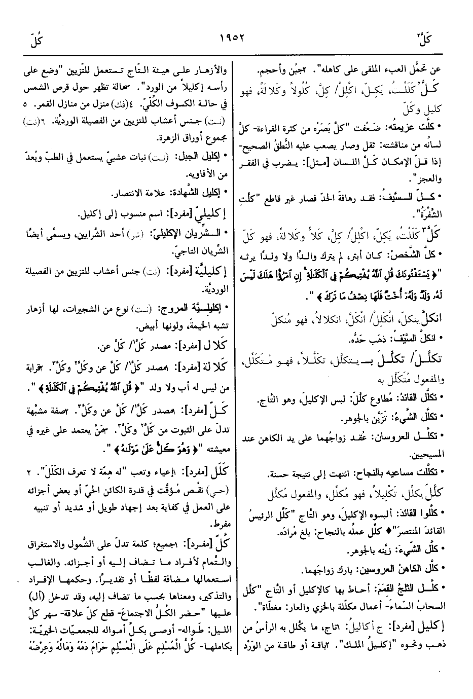 • كلَّ الشَّخصُ: كان أبتر، لم يترك والدًا ولا ولدًا يرثه " {يَسْتَفْتُونَكَ قُلِ اللهُ يُفْتِيكُمْ فِي الْكَلاَلَةِ إِنِ امْرُؤٌ هَلَكَ لَيْسَ لَهُ وَلَدٌ وَلَهُ أُخْتٌ فَلَهَا نِصْفُ مَا تَرَكَ} ".