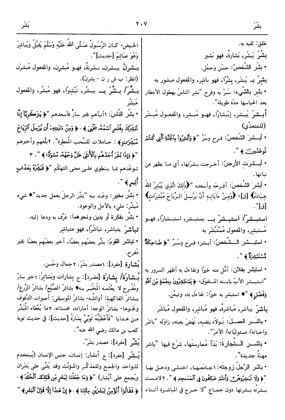 • أبشرَ الشَّخصَ: أفرحَه وأسعده " {ذَلِكَ الَّذِي يُبْشِرُ اللهُ عِبَادَهُ} [ق]- {وَمِنْ ءَايَاتِهِ أَنْ يُرْسِلَ الرِّيَاحَ مُبْشِرَاتٍ} [ق] ".