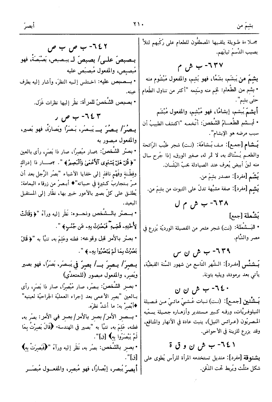 • بصُر بالشَّخص ونحوه: نَظَر إليه ورآهُ " {وَقَالَتْ لأُخْتِهِ قُصِّيهِ فَبَصُرَتْ بِهِ عَنْ جُنُبٍ} ".