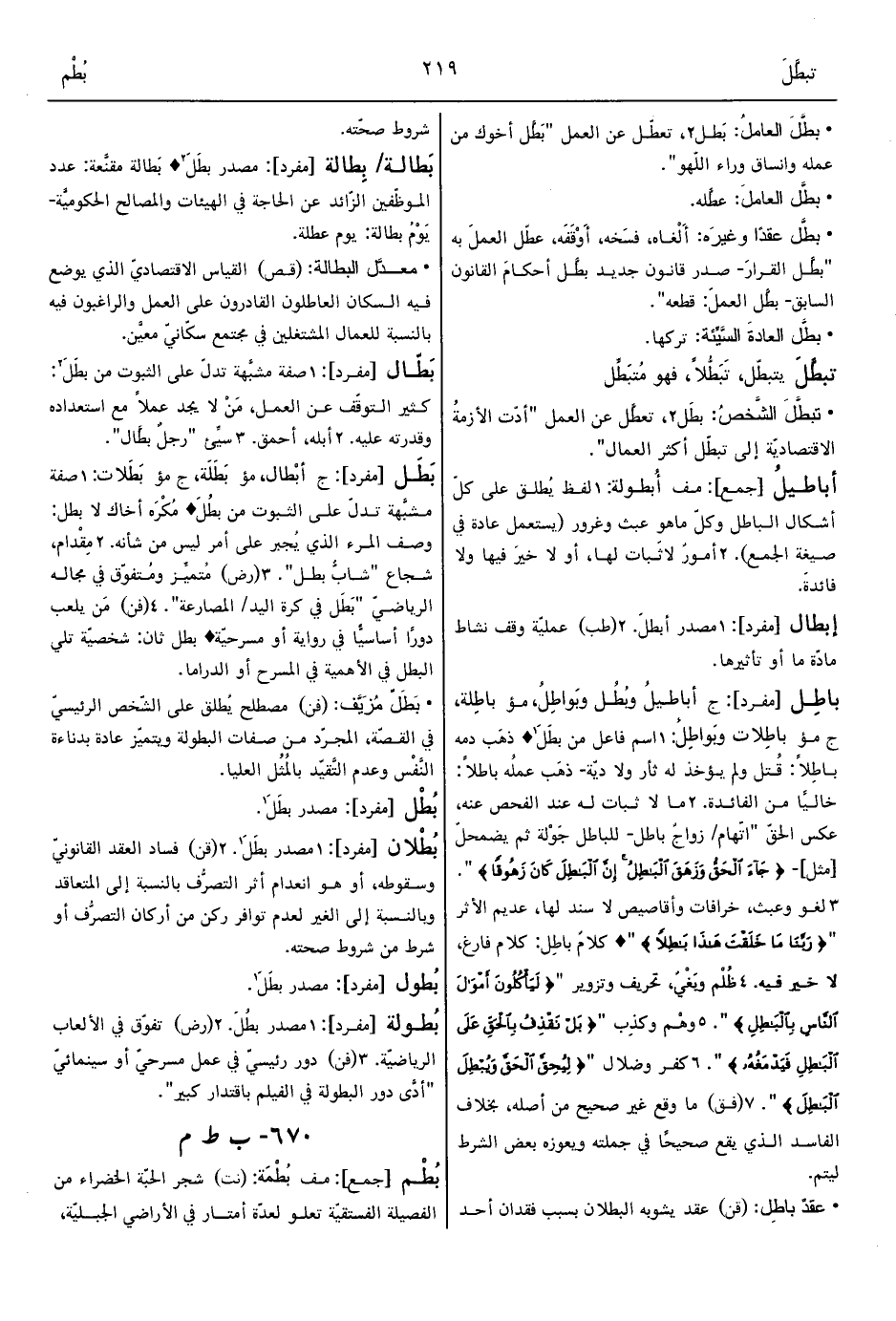 • تبطَّلَ الشَّخصُ: بطَل2، تعطَّل عن العمل "أدّت الأزمةُ الاقتصاديّة إلى تبطّل أكثر العمال".