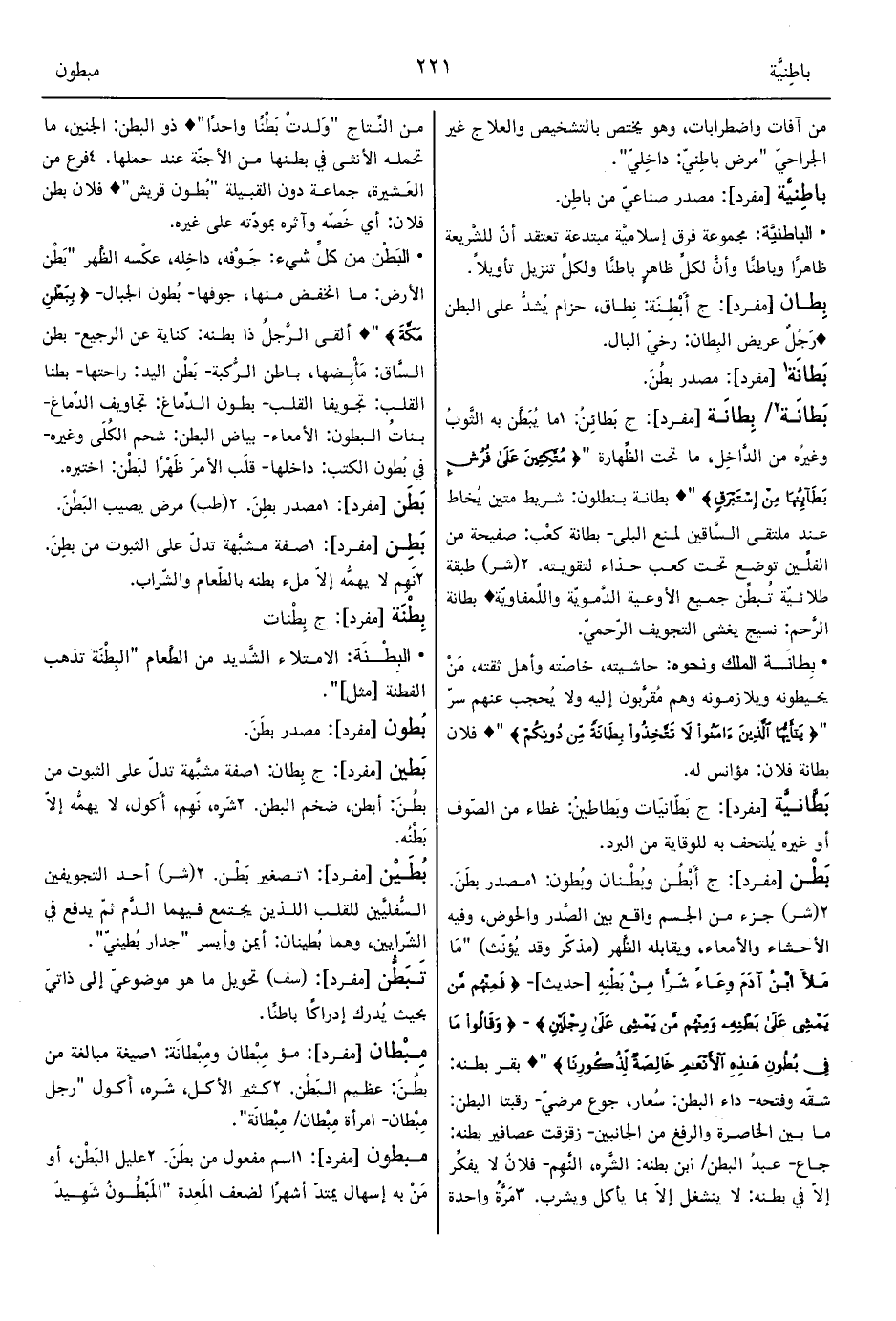 • البَطْن من كلِّ شيء: جَوْفه، داخِله، عكْسه الظَّهر "بَطْن الأرض: ما انخفض منها، جوفها- بُطون الجبال- {بِبَطْنِ مَكَّةَ} "? ألقى الرَّجلُ ذا بطنه: كناية عن الرجيع- بطنا القلب: تجويفا القلب- بطن السَّاق: مَأْبِضها، باطن الرُّكبة- بَطْن اليد: راحتها- بطون الدِّماغ: تجاويف الدِّماغ- بناتُ البطون: الأمعاء- بياض البطن: شحم الكُلَى وغيره- في بُطون الكتب: داخلها- قلَب الأمرَ ظَهْرًا لبَطْن: اختبره.