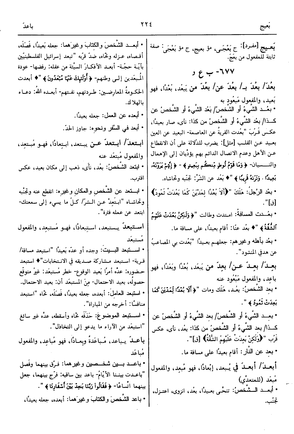 • بعِد الشَّيءُ أو الشَّخصُ/ بعِد الشَّيءُ أو الشَّخصُ عن كذا/ بعِد الشَّيءُ أو الشَّخصُ من كذا: بعُد، نأى، عكس قَرُب " {وَلَكِنْ بَعِدَتْ عَلَيْهِمُ الشُّقَّةُ} [ق] ".