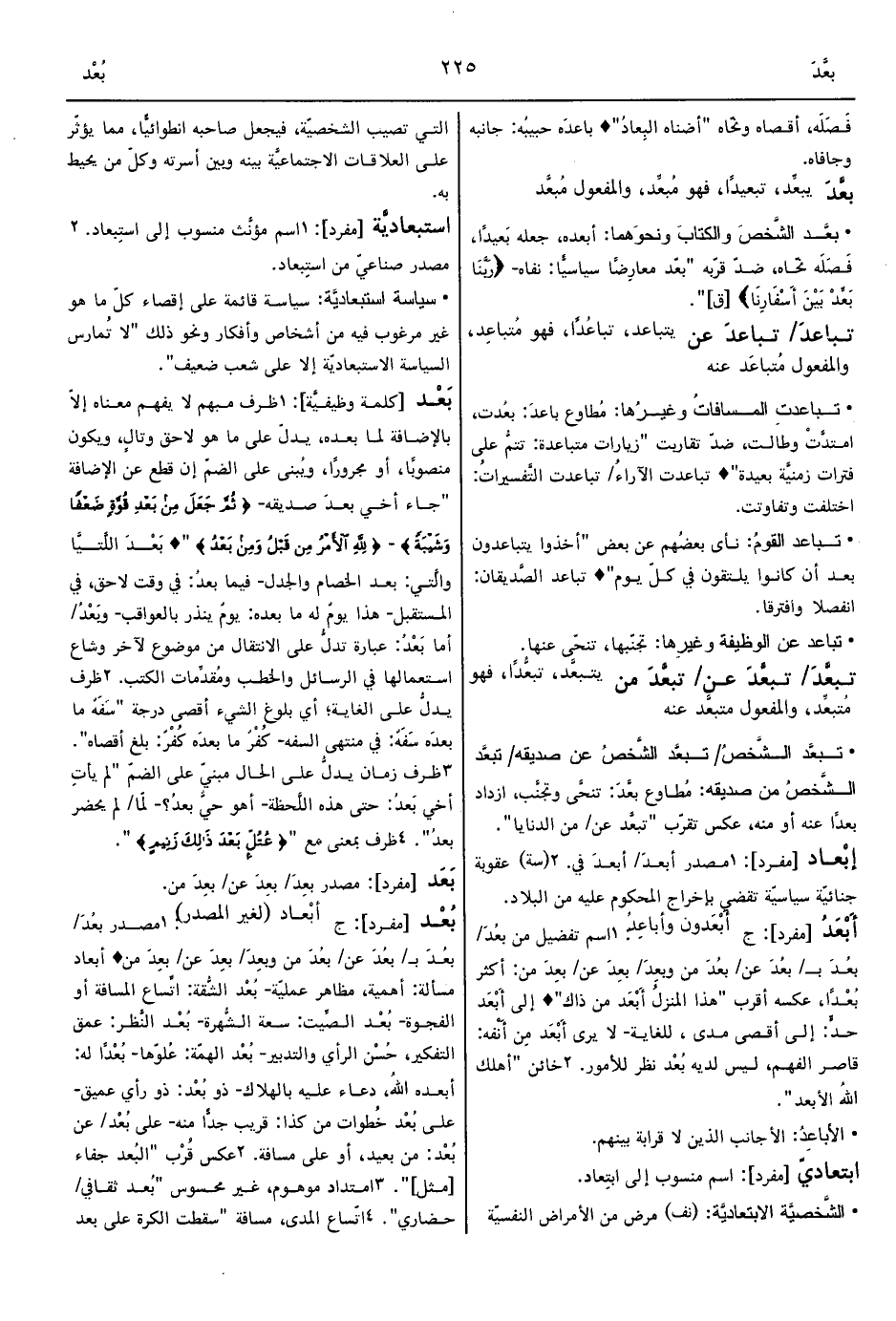 1 - مصدر بعُدَ/ بعُدَ بـ/ بعُدَ عن/ بعُدَ من وبعِدَ/ بعِدَ عن/ بعِدَ من ° أبعاد مسألة: أهمية، مظاهر عمليّة- بُعْد الشُّقة: اتِّساع المسافة أو الفجوة- بُعْد الصِّيت: سعة الشُّهرة- بُعْد النَّظر: عمق التفكير، حُسْن الرأي والتدبير- بُعْدًا له: أبعده اللهُ، دعاء عليه بالهلاك- بُعْد الهمّة: عُلوّها- ذو بُعْد: ذو رأي عميق- على بُعْد خُطوات من كذا: قريب جدًّا منه- على بُعْد/ عن بُعْد: من بعيد، أو على مسافة.