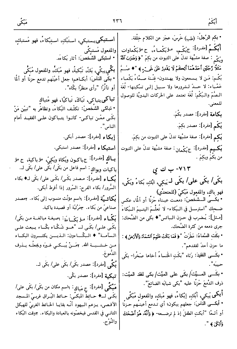 • بكَى الشَّخصُ: دمعت عيناه حُزنًا أو ألمًا، عكس ضحِك "استرسل في البُكاء- لا تُعلِّمَ اليتيمَ البُكاءَ [مثل]: يُضرب في حزن البائس" ° بكى من الضَّحك: جرى دمعه من كثرة الضَّحك.