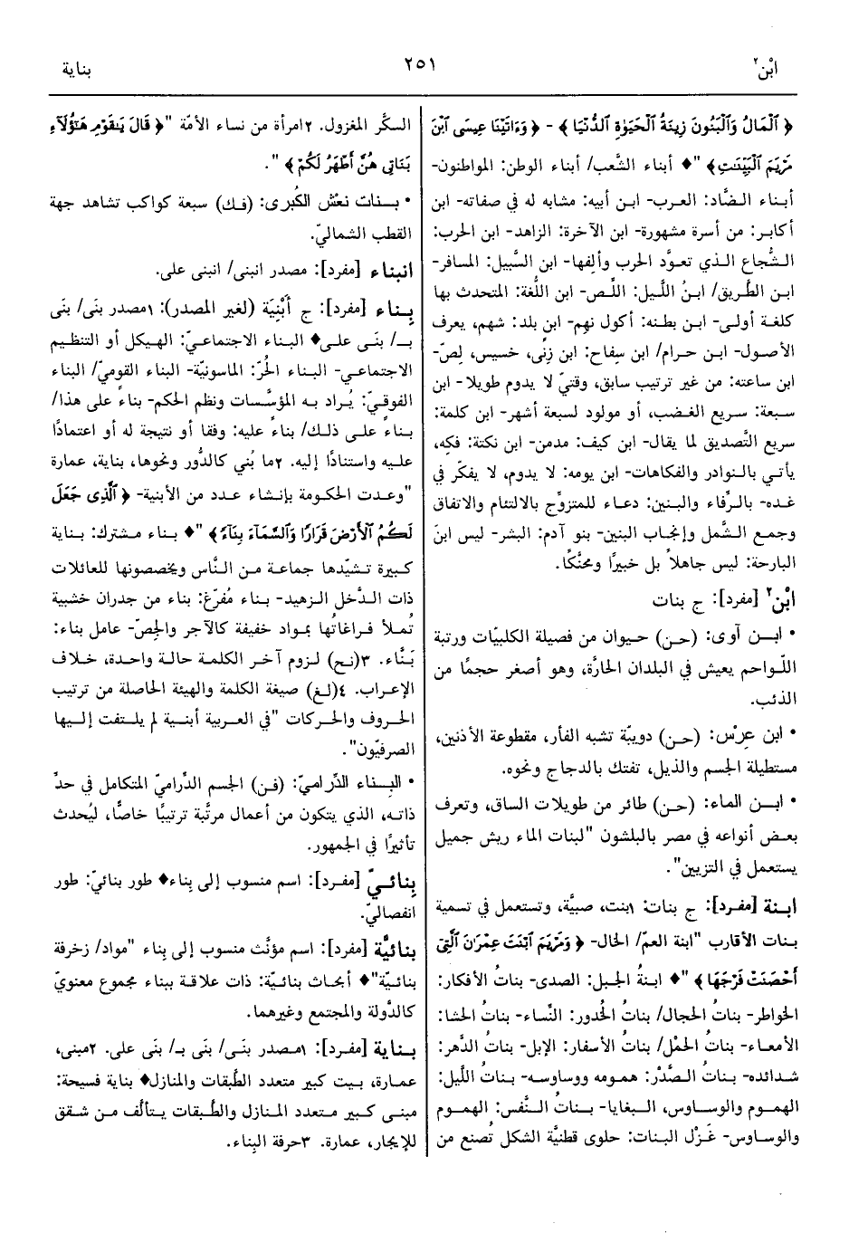 1 - بنت، صبيَّة، وتستعمل في تسمية بنات الأقارب "ابنة العمّ/ الخال- {وَمَرْيَمَ ابْنَتَ عِمْرَانَ الَّتِي أَحْصَنَتْ فَرْجَهَا} " ° بناتُ الأفكار: الخواطر- بناتُ الدَّهر: شدائده- بناتُ الصَّدْر: همومه ووساوسه- بناتُ اللَّيل: الهموم والوساوس، البغايا- ابنةُ الجبل: الصدى- بناتُ الحشا: الأمعاء- بناتُ الحمْل/ بناتُ الأسفار: الإبل- بناتُ النَّفس: الهموم والوساوس- غَزْل البنات: حلوى قطنيَّة الشكل تُصنع من السكَّر المغزول- بناتُ الحجال/ بناتُ الخُدور: النِّساء.